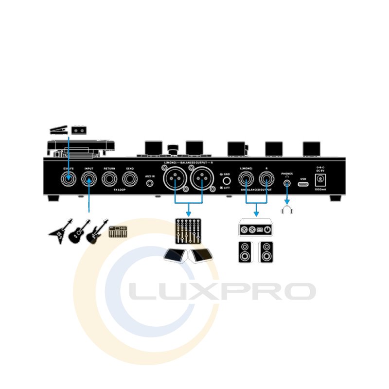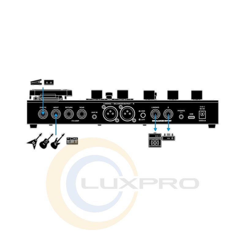 - входи: 2 x 1/4″ Unbalanced (TS) (guitar, return); 1 x 1/8″ Stereo (TRS) (aux); 1x USB 2.0 Type-C;