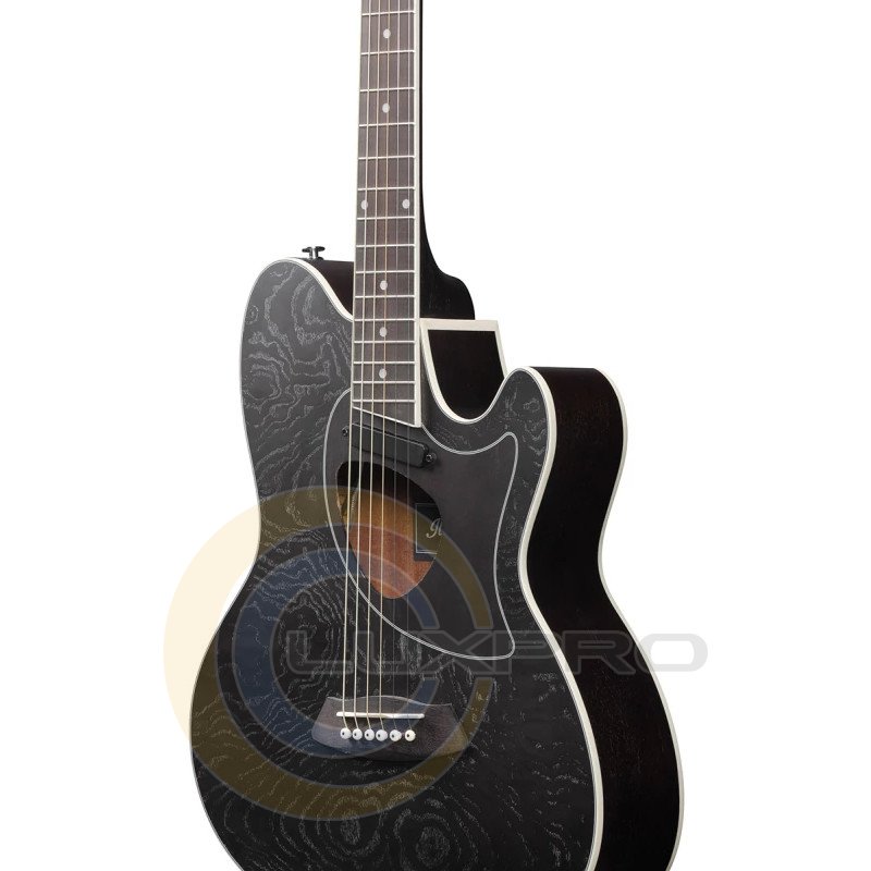 Електроакустична гітара TCM50 GBO має корпус з формою Talman з вирізом, який забезпечує легкий доступ до верхніх ладів та комфортну гру. Верхня дека виготовлена з фігурного ясеня, а нижня та бічні – із сапелі, що надає гітарі теплий та багатий звук. Гриф із окуме має накладку перплхарт та білі точкові маркери ладів. Бридж також виконаний з перплхарту та має спеціальні штифти Ibanez Advantage, які полегшують заміну струн.
