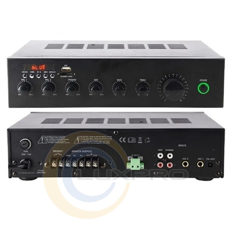 PA60MBT - трансляційний підсилювач використовується підвищення характеристик потужності переданих електричних звукових імпульсів. Його застосування є актуальним під час трансляції фонової музики, сигналів оповіщення, передачі на великі відстані голосових оголошень.