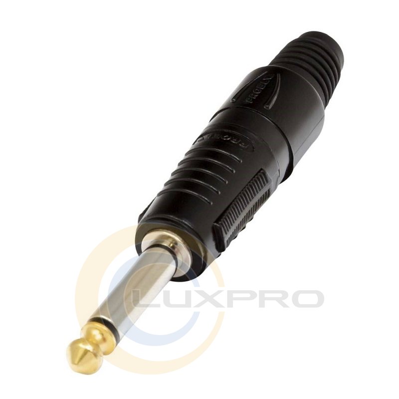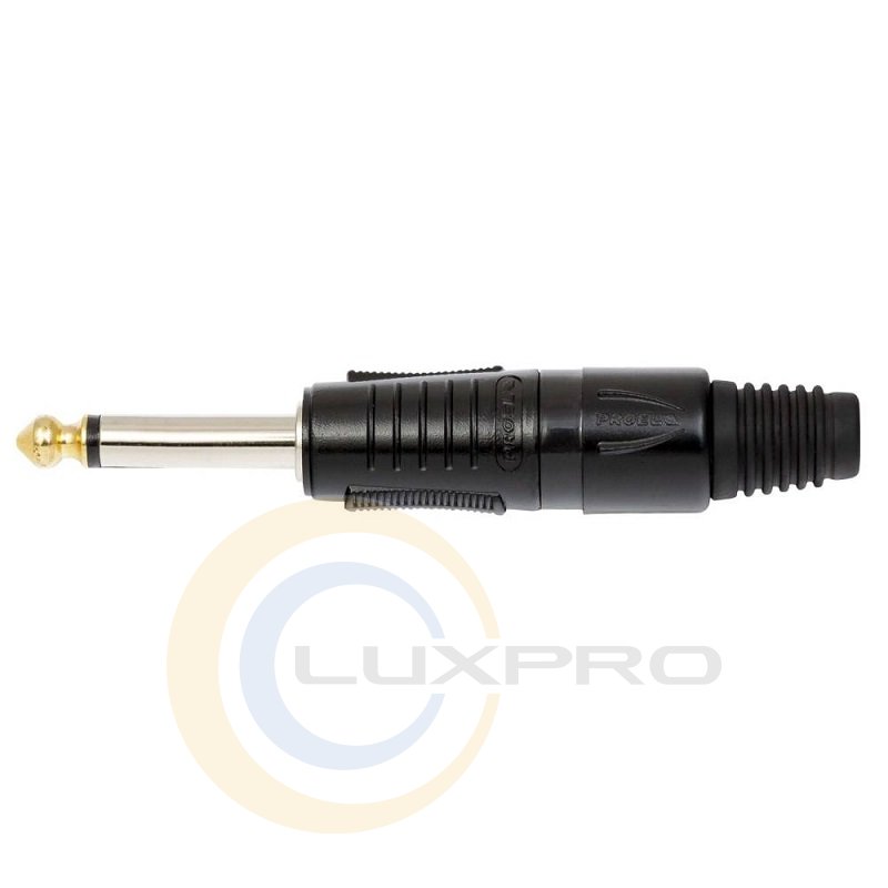 Професійний штекер моно-джек Ø 6,3 мм. - 1/4 дюйма, позолочений наконечник, литий алюмінієвий корпус з алюмінієвим кільцем з'єднувальним і внутрішньою нейлоновою системою затиску кабелю. Колір чорний.