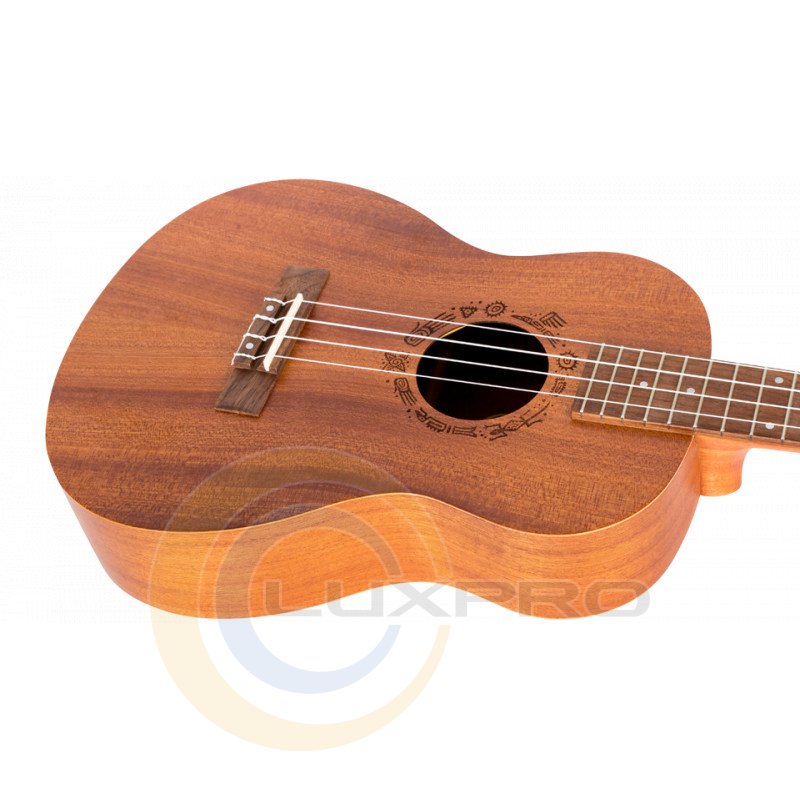 NUB310 Baritone - укулеле. Сапеле - це світла деревина з тропічної Африки з кольором від золотого до темно-коричневого. Як близький родич червоного дерева, його текстура однорідна і має хороший натуральний блиск. Його природний резонанс посилюється та підкреслюється за рахунок вигнутої задньої спинки, надаючи чисте та яскраве звучання. Розетки на наших укулелі намальовані вручну та вигравіровані лазером.