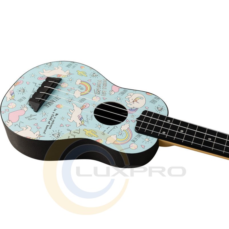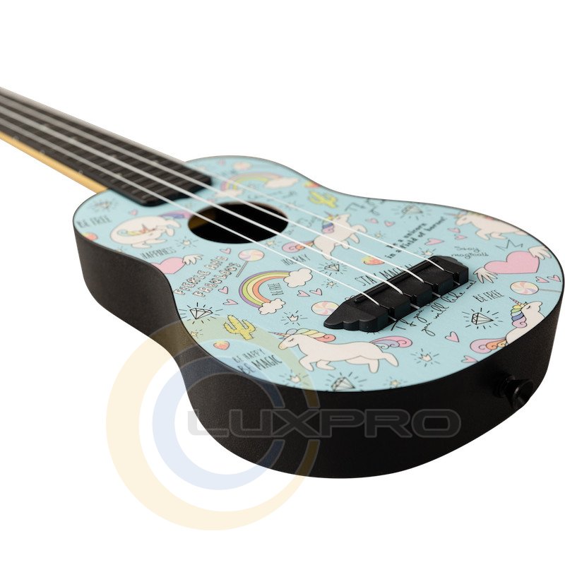 TUS40 Unicorn Travel soprano - укулеле. Завдяки ширшій вигнутій спинці з АБС-пластику, ця мала має більшу гучність в середньому діапазоні, ніж звичайне сопрано, а також краще резонує і звучить яскравіше. Чи варто говорити про довговічність і стійкість до перепадів вологості, головних ворогів дерев'яних гавайських гітар. Звукова плата TUS-40 Unicorn прикрашена чудовим принтом на ламінаті з липи. Липа відрізняється яскравим звучанням та гладкою текстурою. Пластина грифа відповідає блискучому дизайну деки.