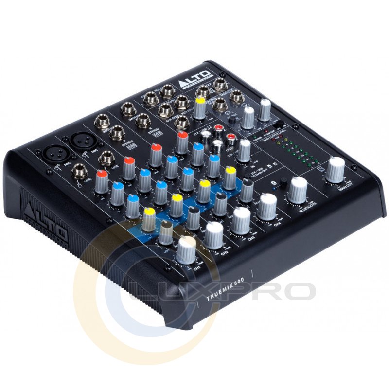 Мікшерний пульт TRUEMIX600. Bluetooth також підтримує пару телефонів без зворотного зв'язку, використовуючи технологію mix-minus, функцію, яку не підтримує жодна інша серія аудіомікшерів цього класу. Є шість аналогових входів з великим запасом потужності для мінімізації шуму і обмеження сигналу. Вхідні мікрофонні канали оснащені входами XLR, які відмінно підходять для підключення динамічних або конденсаторних мікрофонів з фантомним живленням 48 В. Ці канали мають симетричні лінійні входи ¼ дюйма для підключення інструментів та інших сигналів лінійного рівня. Також є два стереовхідних канали, кожен з яких має два балансні ¼-дюймові TRS-входи. Ці входи ідеально підходять для джерел звуку лінійного рівня. Всі канали оснащені двосмуговим еквалайзером з ручками з кодуванням кольорів, які дозволяють легко налаштувати ідеальний звук при роботі в умовах низького освітлення.