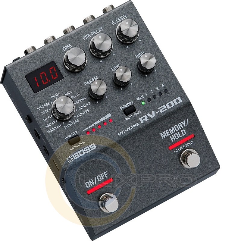 У RV-200 передбачена пам'ять для зберігання 127 звуків реверберації, тому ваші улюблені налаштування завжди готові до роботи. Два вбудовані педальні перемикачі мають велику універсальність і дозволяють перепризначити їх цілі відповідно до ваших потреб. Наприклад, ви можете обійти ефект, прокрутити пам'ять і активувати функцію Hold, щоб ефект реверберації продовжувався доти, доки натиснути перемикач. Також можна призначити такі потужні ефекти як Warp, Twist і Fade.
