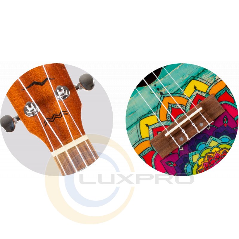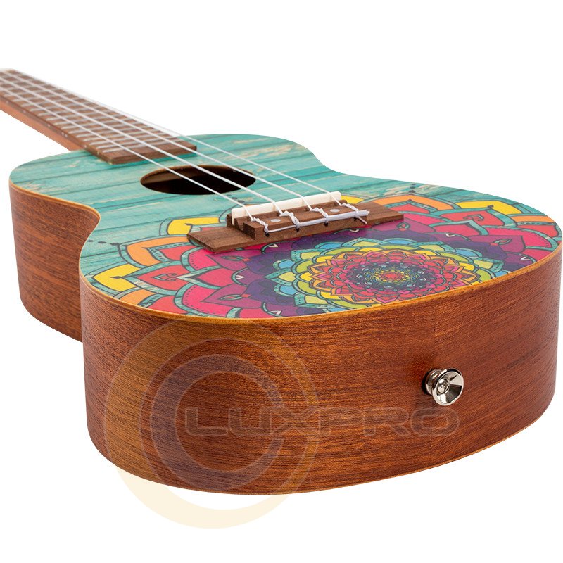 AUC33 Mansion, Concert- укулеле з червоного дерева з яскравим дизайном, що запам'ятовується. Укулеле концерт з верхньою декою з ламінату ялинки та корпусом з ламінату червоного дерева з яскравим та барвистим дизайном.