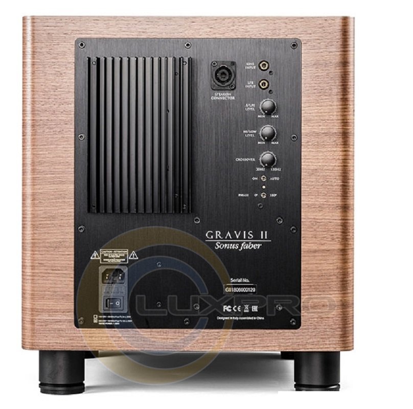 Активний сабвуфер Sonus Faber Gravis II, дифузор низькочастотника має малу вагу та підвищену жорсткість, і переміщається з великою амплітудою завдяки еластичному підвісу та потужній магнітній системі. Сталевий кошик динаміка стійка до паразитних вібрацій, тому навіть під час роботи сабвуфера на підвищеній гучності чутних спотворень не виникає. Апарат встановлений на високих потужних опорах, завдяки чому якість басів не залежить від типу покриття для підлоги.