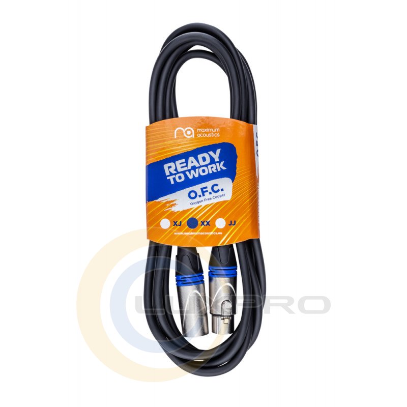 Професійний мікрофонний кабель від бренду Maximum Acoustics, виготовлений з 6 мм екранованого кабелю з використанням безкисневої міді (OFC) та оснащений конекторами XLR-male - XLR-female. Дана модель має довжину кабелю 3 м. Колір кабелю чорний, а кільця маркувальні конекторів - сині.