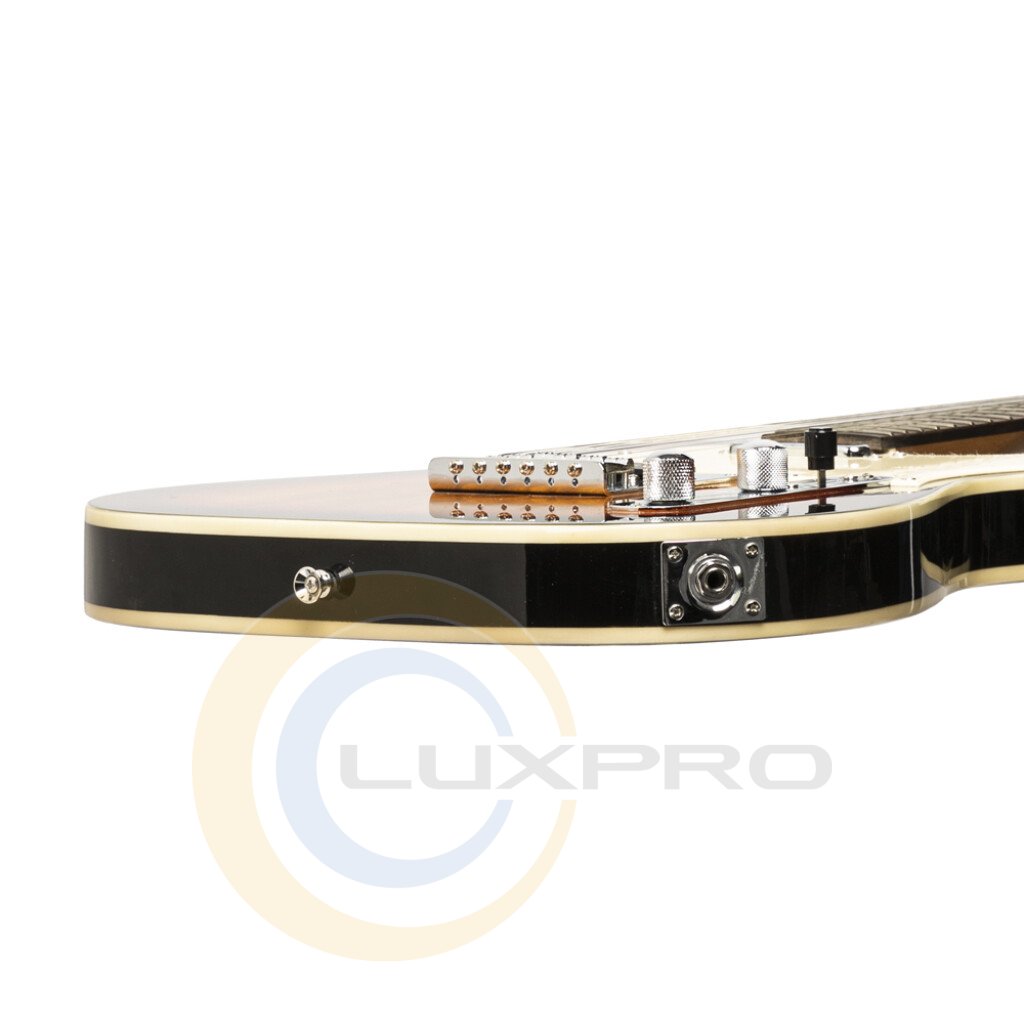Електрогітара STAGG SET-STD SNB оснащена двома звукознімачами-синглами, ручкою регулювання гучності та тону. В електронній схемі встановлено Push/Pull (для послідовного/паралельного включення датчиків) та 3-позиційний перемикач. Бридж виконаний у класичному стилі, зі струнами крізь корпус. На гітарі встановлені надійні литі шпильки з хромованими бутонами. Верхній поріжок - кістяний. На гітару встановлено струни Корейського виробництва та пікгард кольору слонової кістки.
