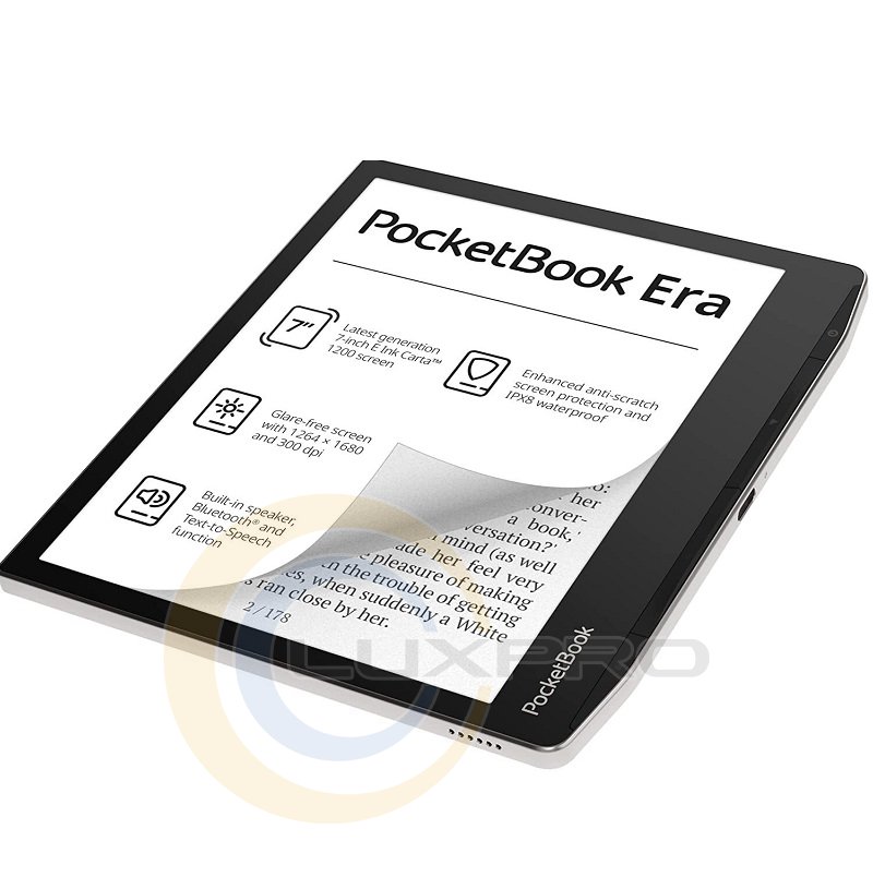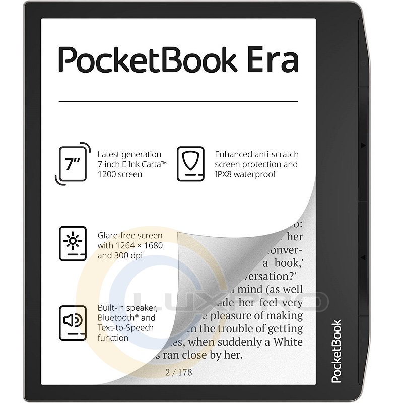 Завдяки цій функції PocketBook Era може прочитати вголос будь-який текстовий файл, перетворивши його на аудіокнигу. Перетворення тексту на мову підтримує до 26 мов. Стандарт захисту від води IPX8 та покращений захист екрана від подряпин забезпечують користувачам більше впевненості та комфорту при читанні.