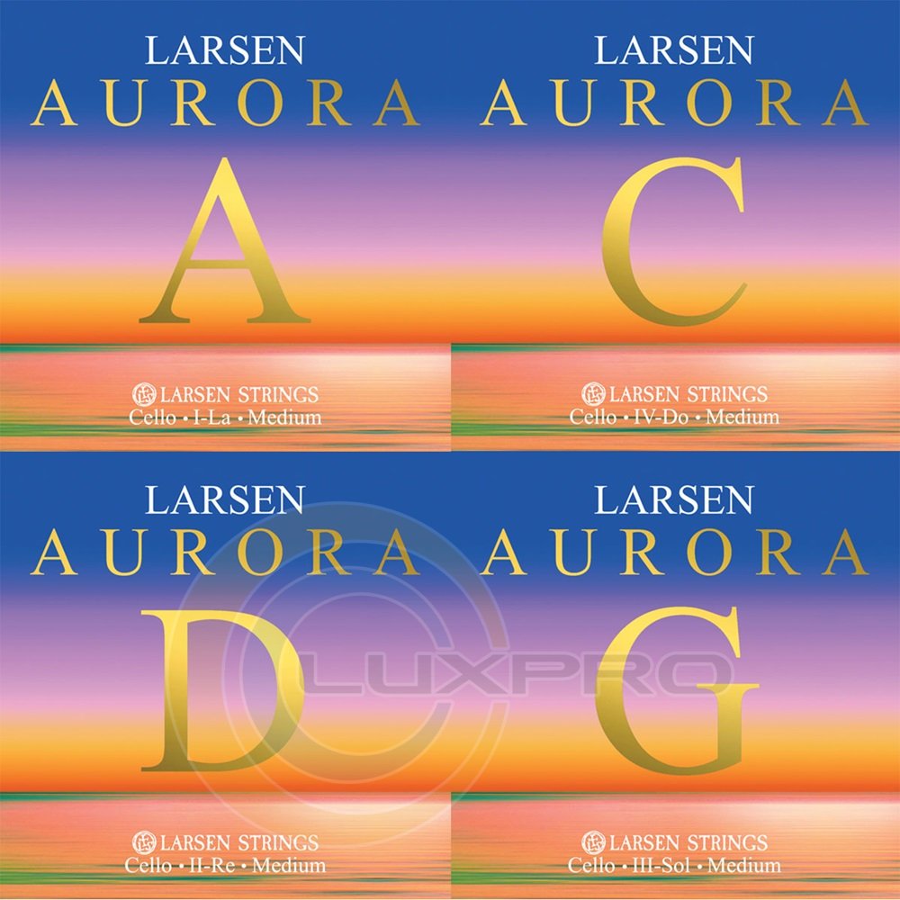Larsen Aurora має яскраве звучання без металевої різкості. У лінійку Aurora увійшла зовсім нова, вдосконалена струна Ля, а також оновлені струни Ре, Сіль і До. Усі чотири струни виготовлені на надійній сталевій основі. Акорд струн надає вражаючий відгук та відмінні акустичні характеристики. Віолончальні струни Aurora доступні із середньою (Medium) і сильною (Strong) силою натягу для інструментів у розмірі 4/4, а також - із середньою (Medium) силою натягу для інструментів у розмірах 3/4, 1/2, 1/8 та 1/16.