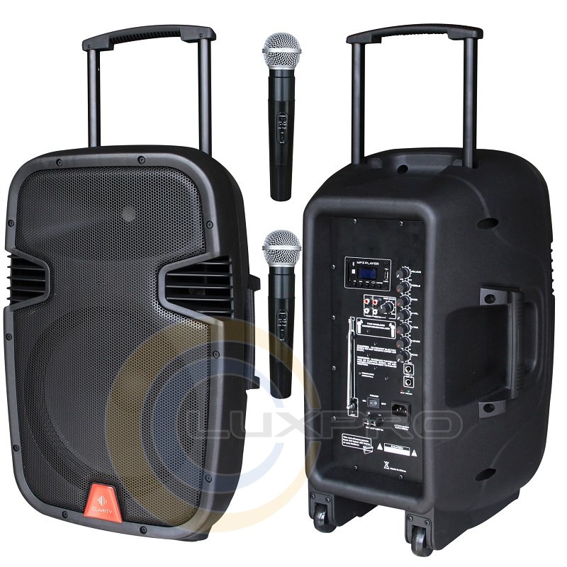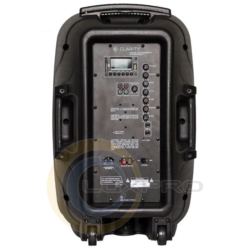 Мобільна акустична система призначена для відтворення звукових фонограм від MP3 плеєра USB флешки, SD карти, від ноутбука, CD плеєра, мікшера і інших джерел звуку. Також є вбудований FM тюнер і Bluetooth. Акустична система має два вбудованих радіомікрофона. Мобільна акустична система розрахована на роботу від мережі змінного напруги 230В (115В). Працездатність мобільної системи зберігається при живленні її від вбудованої акумуляторної батареї до 8 годин безперервної роботи (в залежності від заряду батареї і рівня гучності).Мобільні колонки Clarity MAX15MBAW буде незамінна в ході виступу артистів і політиків на відкритих площах, відкриття і проведення акцій в магазинах / салонах а також просто для музичного супроводу заходу та проведенні заміських вечірок - де основна проблема, це відсутність стаціонарного напруги 220 В для акустичних систем!Прості в експлуатації, вони допоможуть забезпечити найкращий ефект від виступу. Чіткість звучання, компактність + мобільне розгортання музичного супроводу ... все це ви зможете знайти в автономній акустичної системі Clarity MAX15MBAW.ТОП питання від клієнтів:
