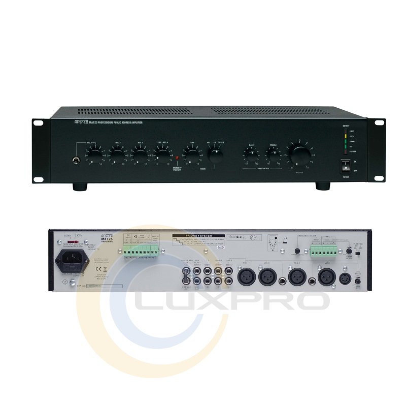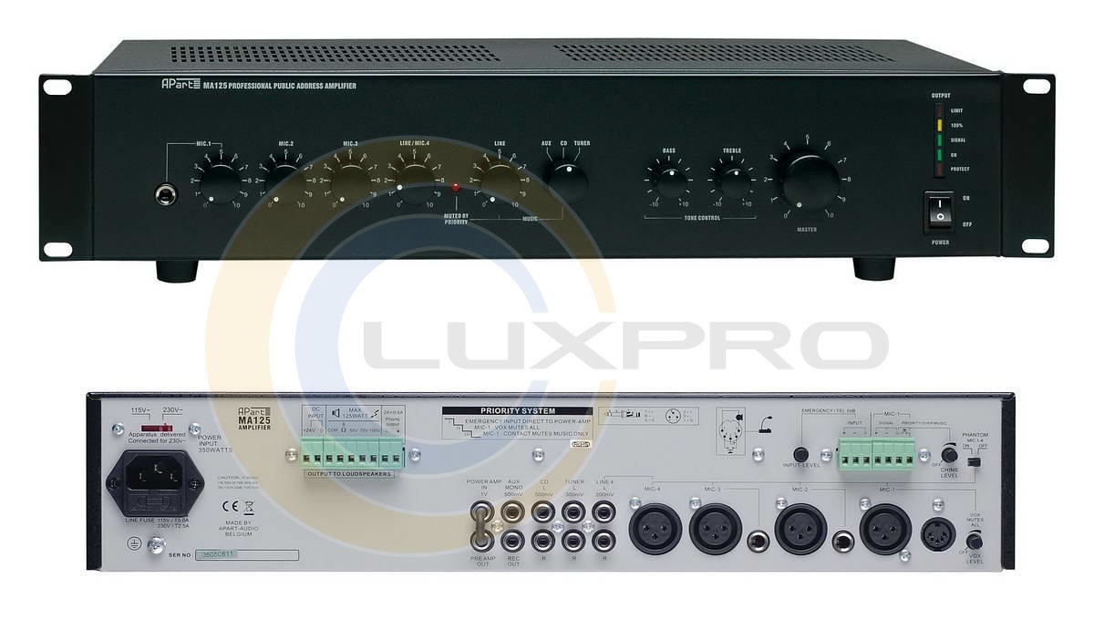 Підсилювач такоже має вихід 24В, Який можна використовуват для актівації реле примусове включення у аттенюаторів, напруга на цьому віході з'являється при актівації будь-которого пріорітетного входу. Вбудований генератор сигналу "ГОНГ". Підсилювач дозволяє підключати до шкірного мікрофонного входу по 2 мікрофони MIC-PAT-D. У комплект поставки входять кріплення "Вуха" для установки підсилювача в апаратну шафу або стійку 19 ".Номінальнa вихідна потужність RMS: 125 Bт.Характеристики: