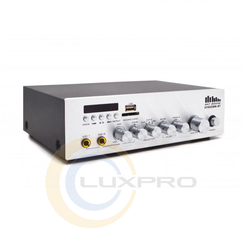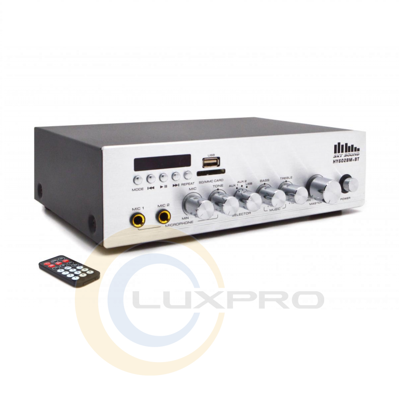 SKY SOUND HY602MB+BT - двоканальний підсилювач потужності для підключення до низькоомних акустичних систем трансляції фонового озвучування та мовного сповіщення.