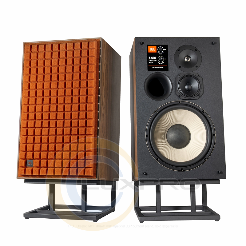 Акустична система L100 CLASSIC MKII (JBLL100MK2ORG). Удосконалення включають модернізацію низькочастотного, середньочастотного та високочастотного драйверів, а також переглянуту кросоверну мережу для підтримки бі-вайрингу/бі-ампінгу за допомогою високоякісної термінальної чаші з двома комплектами позолочених сполучних гнізд. JBL L100 Classic MkII має натуральний шпон із сатиновим покриттям з горіхового дерева та яскраві грати Quadrex, доступні в чорному, оранжевому чи синьому кольорах.