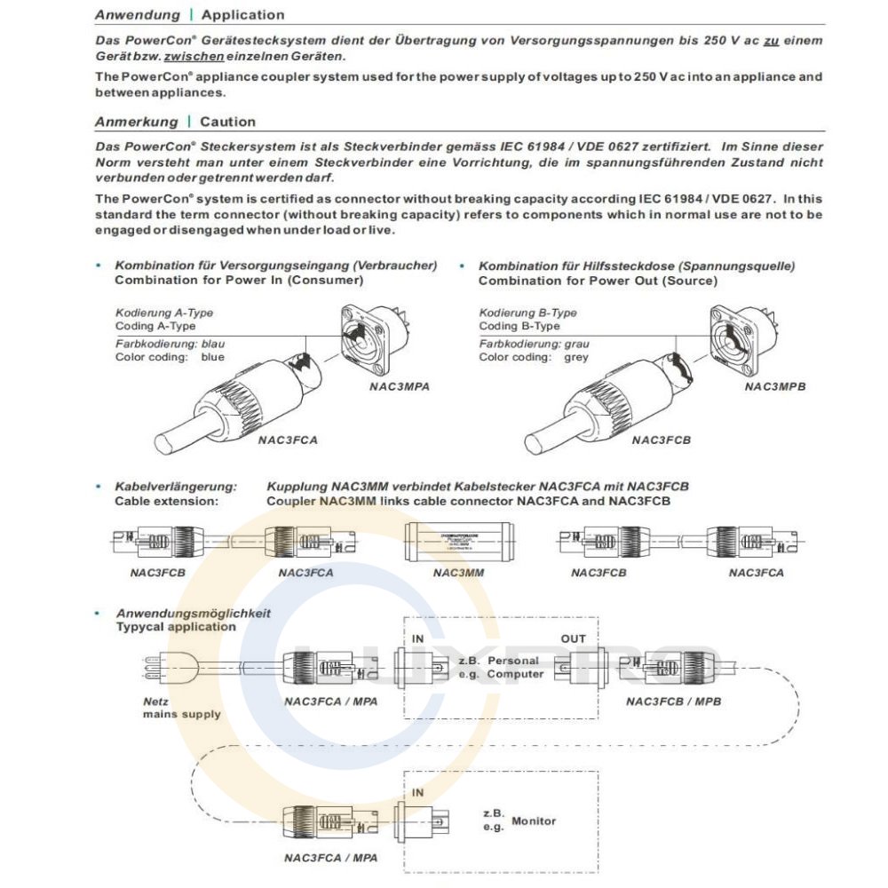 Коннектори powerCON є спеціальними мережевими роз'ємами з замками мають 3-х контактне з'єднання високовольтних ліній для живлення потужних приладів. Є попередній заземлюючий контакт, замість під'єднується окремого заземлення на шасі приладу. Вдала компоновка з міцним корпусом в поєднанні з фіксуючим механізмом необхідна для того, щоб гарантувати безпечне підключення до джерела живлення.Увага: Роз'єм powerCON не має відключає властивості. Тобто не слід приєднувати або від'єднувати під навантаженням або при включеному приладі!Особливості: