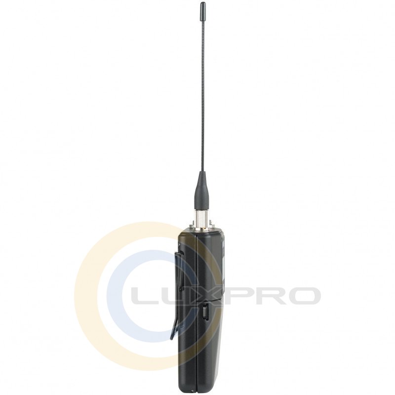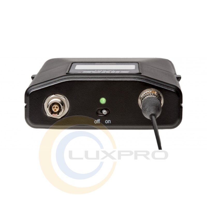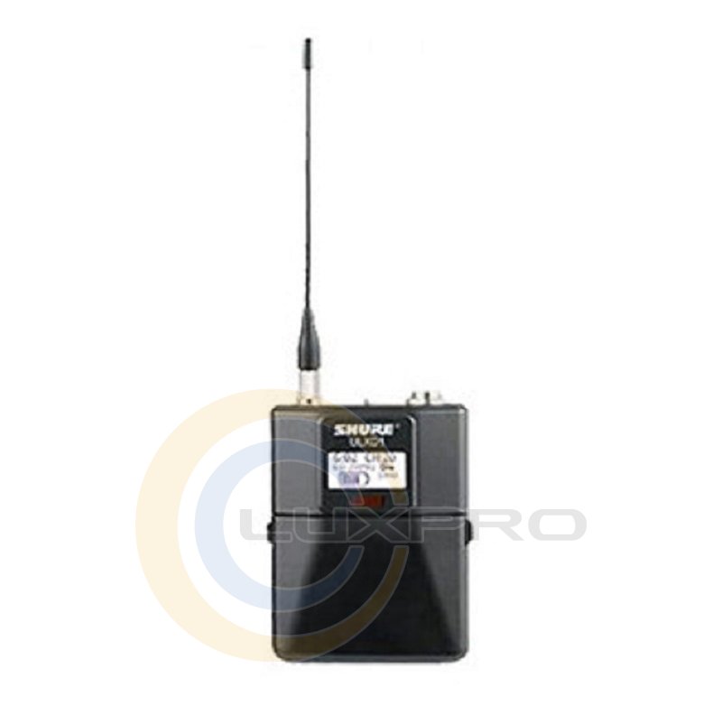 Передавач Shure ULXD1 здатний працювати з мікрофонними або інструментальними сигналами, вхід для підключення зроблено на небалансному 4-контактному роз'ємі TA4M. Прилад оснащений однією знімною антеною, вхід для якої реалізований на роз'єм SMA. На лицьовій частині корпусу є РК-дисплей, що наочно відображає рівень залишку заряду, вибрану частоту і номер каналу. Енергозабезпечення походить від двох батарейок типу АА або від літій-іонного акумулятора Shure SB900A, що заряджається, який купується окремо. Час безперервної роботи може сягати 11 годин. Трансмітер виконаний у міцному повністю металевому корпусі, надійно закріплюється на ремені та не заважає рухом за рахунок малих габаритів та ваги. У комплект поставки входять м'який чохол для транспортування та дві батареї.