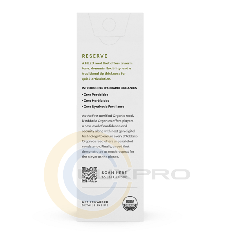 ODKR0520 - тростини забезпечують неперевершену зручність гри без хімікатів, пестицидів чи синтетичних добрив. Від поля до фінальної обробки тростини Organic Reserve відповідають стандартам органічної сертифікації Міністерства сільського господарства США, зберігаючи при цьому їхнє французьке коріння.