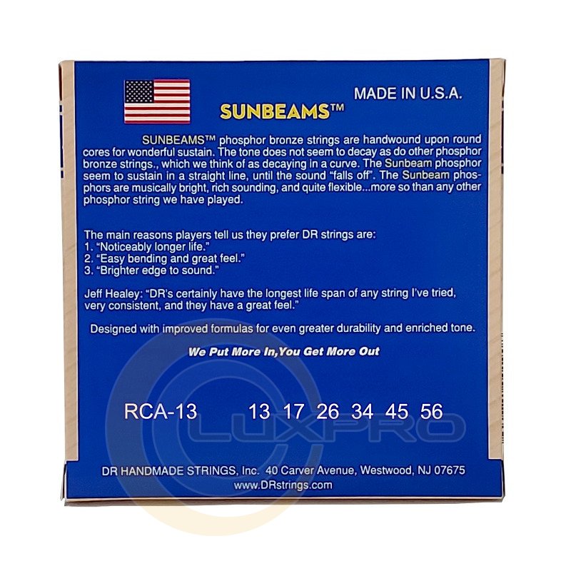 RCA-13 - струни Sunbeam намотані вручну на круглі сердечники, що дає приголомшливий результат... чудовий сустейн... відмінний сустейн. Здається, що тон не згасає, як у інших струн із фосфор бронзи, які традиційно згасають по кривій. Sunbeam ніби тримає пряму лінію, поки звук не «впаде». Струни Sunbeam також відрізняються музичним яскравим та насиченим звучанням. Будучи намотаними на круглому сердечнику, вони також дуже гнучкі, більше ніж будь-які інші струни, на яких ми грали.