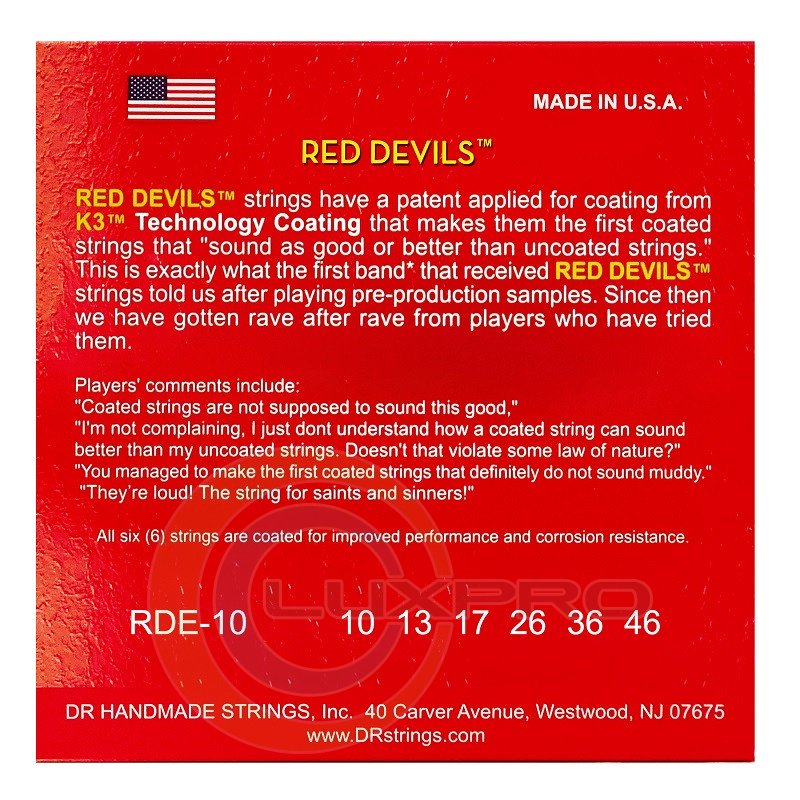 Завдяки шестигранному сердечнику та обмотці із срібної сталі, їх гучний і агресивний звук доповнює їхній яскравий колір. Всі струни в наборі покриті червоною версією запатентованого покриття DR K3™, яке забезпечує довговічність, більшу гучність, менше небажаних обертонів, а також видатну чистоту та артикуляцію.