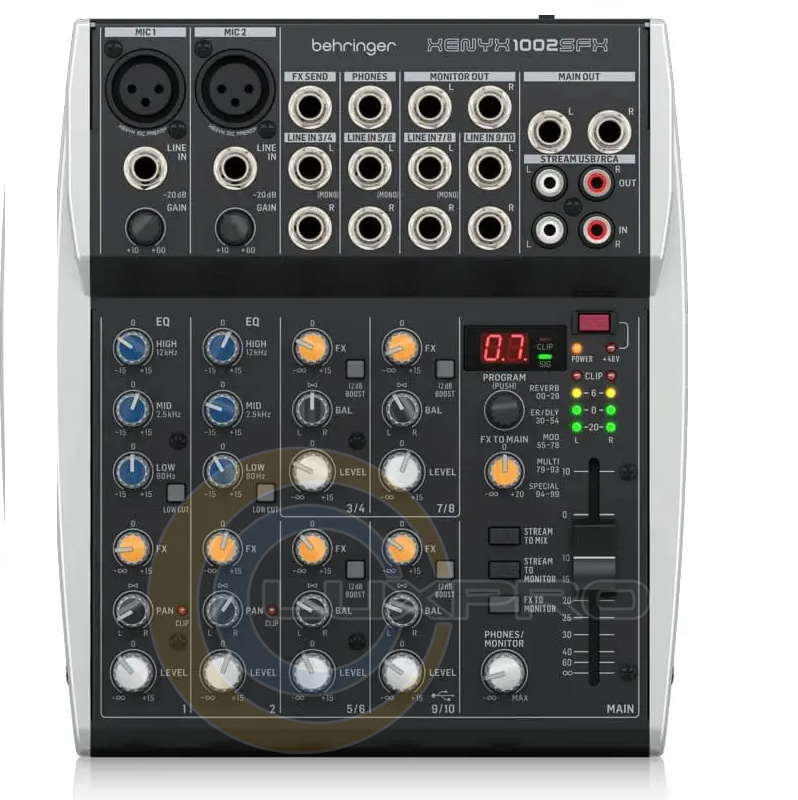 Мікшер XENYX 1002SFX має унікальну конфігурацію, що включає два моно канали з вбудованим еквалайзером і низькочастотною фільтрацією, а також чотири стереоканали, що підтримують підключення через стереовходи RCA і стереовхід USB. Це дозволяє одночасно змішувати та обробляти до 14 різних аудіосигналів, що створює чудові можливості для стримінгу, моніторингу через навушники та виведення на високоякісні виходи TRS.