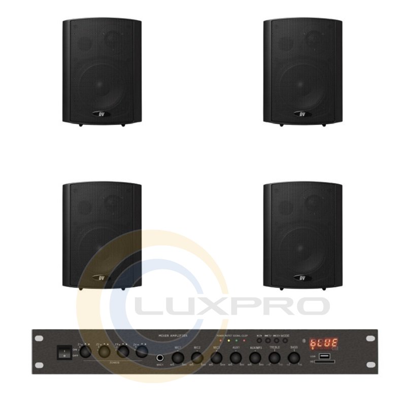 Акустичний комплект LA804PB5B для фонового озвучування приміщень, офісів, кафе та відкритих майданчиків середньою площею 80 кв. м. У комплект входить пристрій для відтворення звуку на АС та набір акустичних систем. Кабель для підключення акустичних систем не входить.