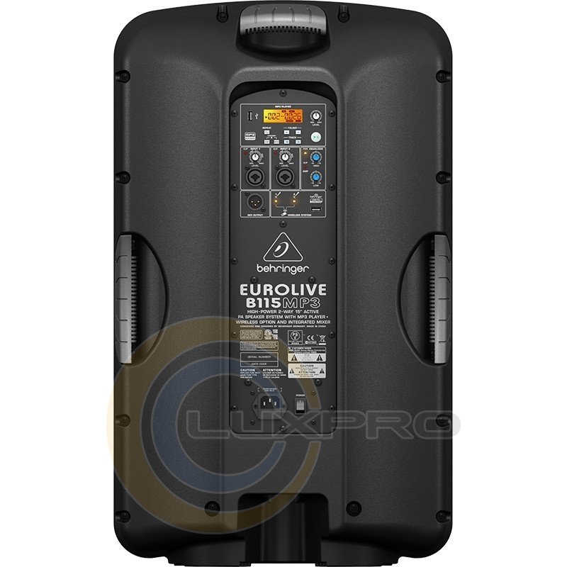 Акустична система B115MP3-EU. Великий рідкокристалічний дисплей відображає інформацію про заголовок, назву доріжки та додаткові відомості. Бездротова мікрофонна USB-система Wireless Ultralink від Behringer є невід'ємним елементом даної акустичної системи і додає і без того широкому її функціоналу можливість використання бездротового мікрофона. Кабінет також оснащений кріпленнями для монтажу в будь-яких умовах, лінійними та мікрофонними аудіо входами, окремими еквалайзерами для високих та низьких частот, регуляторами рівнів для кожного окремо взятого каналу та багатьма іншими можливостями.