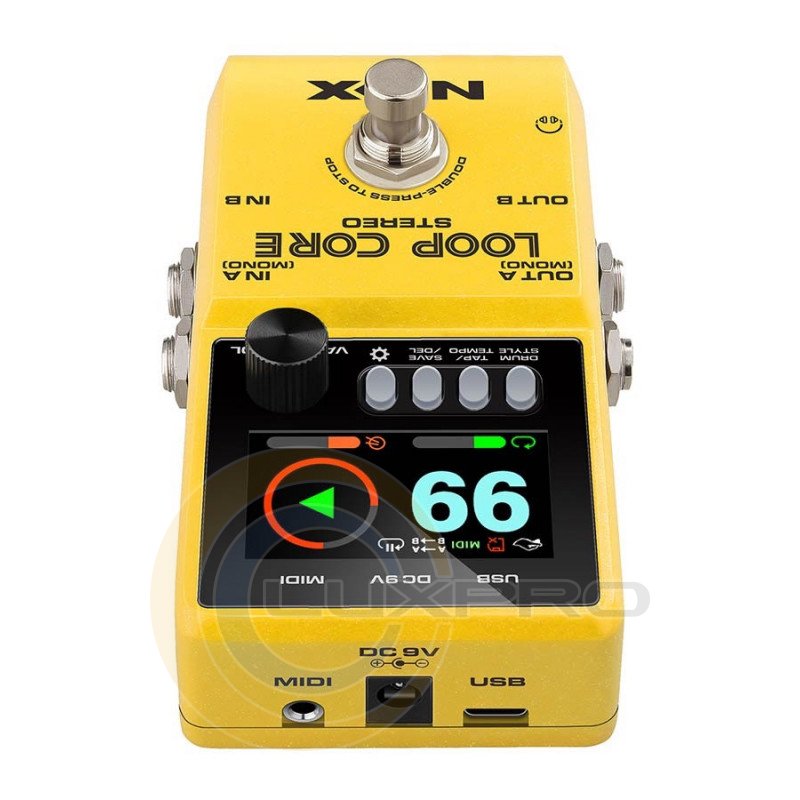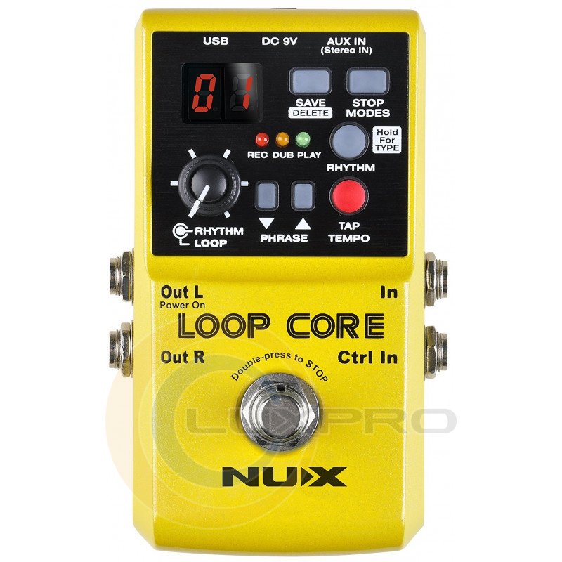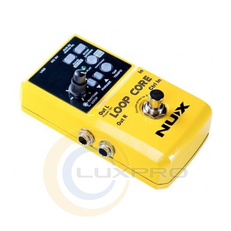 Кнопка TAP дозволяє задавати темп або змінювати його під час відтворення записаної лупи. Кнопки Up та Down вибирають комірку пам'яті, ритмічний патерн та інші параметри. Кнопка ножа використовується для включення/вимкнення таких функцій як запис, накладання, відтворення, undo/redo (скасування/повернення скасованого) та стирання. Nux Loop Core має великі комутаційні можливості, так, наприклад, спеціальний стерео вхід AUX IN дозволяє подати на педаль стерео аудіо сигнал і записати його як стерео лупа. Пристрій має моно вхід IN, вхід для додаткової педалі управління Ctrl IN, стерео/моно виходи OUT L/Mono, OUT R, роз'єм для підключення живлення та USB гніздо для підключення до комп'ютера, що дозволяє імпортувати та експортувати аудіо інформацію.