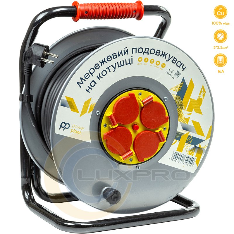 - назва: Подовжувач на котушці PowerPlant 50 м, 3x2.5мм2, 16A, 4 розетки, 100% мідь (JY-20022/50);