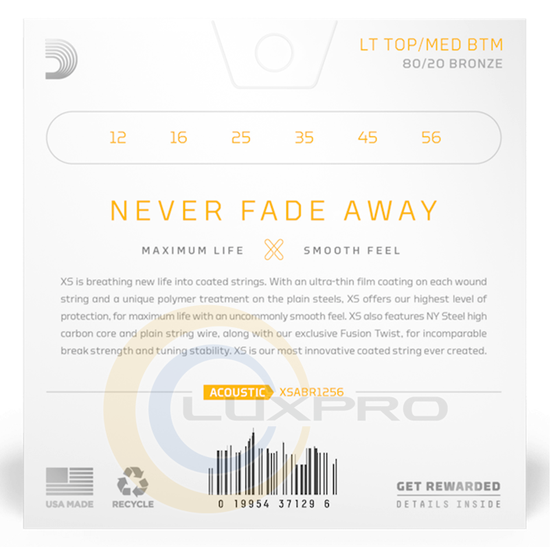 XSABR1256 - струни. XS вдихає нове життя у струни з покриттям. Завдяки ультратонкому плівковому покриттю кожної струни з обмоткою та унікальною полімерною обробкою цілісних сталевих струн XS пропонує найвищий рівень захисту для максимального терміну служби та надзвичайно гладкого відчуття. XS - найінноваційніша струна з будь-коли створених.