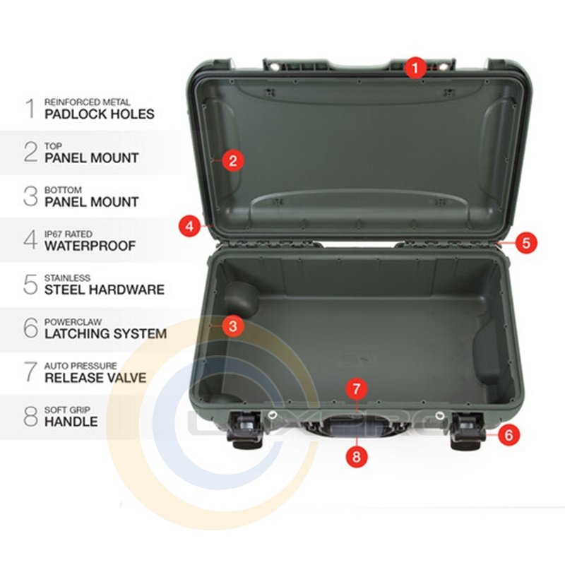 Кейс Nanuk 935 завдяки ексклюзивній системі клямок PowerClaw кейс залишається закритим і захищеним доти, доки ви не будете готові його відкрити. Ударостійкий кейс Nanuk 935 оснащений функцією фіксації кришки для безпечного відкриття корпусу при використанні, а посилені вуха з нержавіючої сталі можна використовувати для кріплення додаткових замків. Дві зручні ручки з м'якими рукоятками та ергономічною формою, спрощують перенесення та транспортування. А самі ручки пружні, щоб уникнути пошкоджень під час подорожей або під час транспортування. Також кейс обладнано автоматичним клапаном скидання тиску.