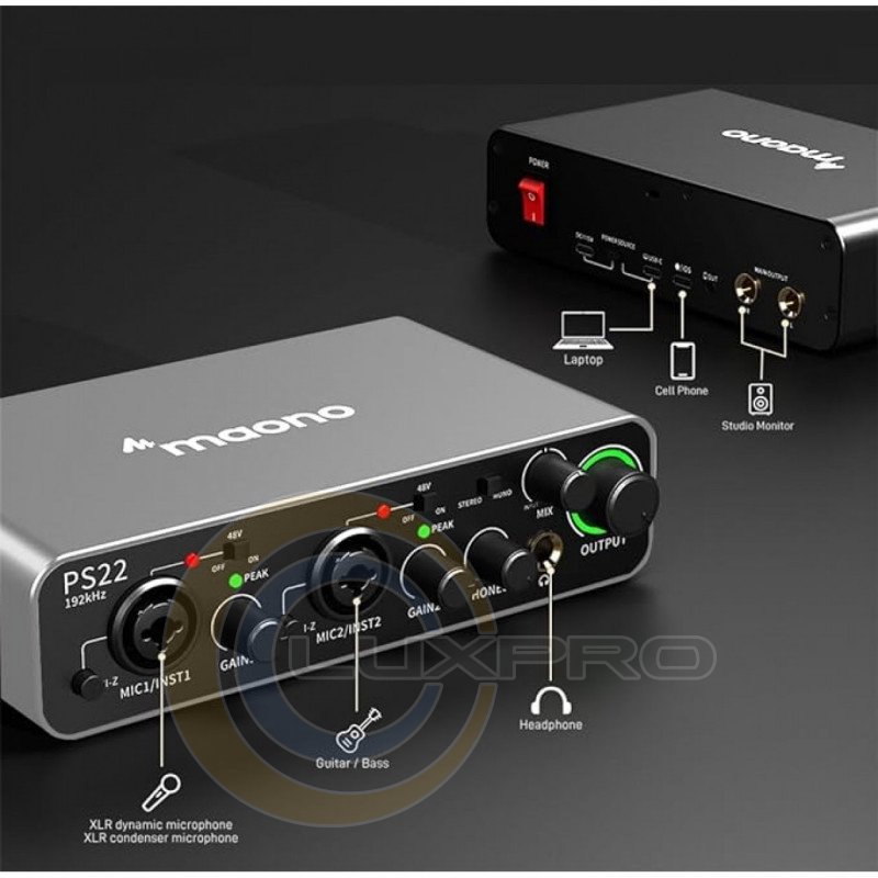 Портативний та універсальний Maono PS22 оптимізований для роботи з мобільними пристроями завдяки двом портам USB-C, які дозволяють одночасно підключати два комп'ютери або інші пристрої, що робить його ідеальним для стримінгу або підкастингу з кількох джерел.