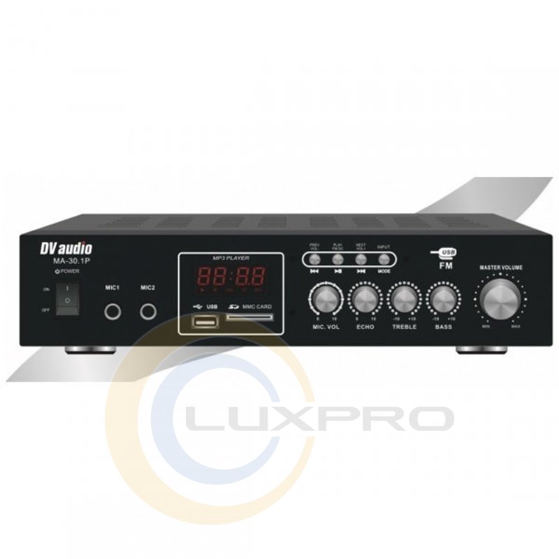 Акустичний комплект MA302CMG5B. Мікшуючий підсилювач потужності DV audio MA-30.1P із вбудованим USB-програвачем та FM-тюнером, а також можливістю відтворення через BLUETOOTH. Використовується у системах фонового озвучування. Оснащений двома мікрофонними входами, двома лінійними входами та лінійним виходом. Управління USB-програвачем здійснюється за допомогою кнопок stop/play, повтор, попередній трек, наступний трек з передньої панелі підсилювача. USB-плеєр підтримує USB-флешки максимальним об'ємом пам'яті до 16Гб. Управління FM-тюнером здійснюється також з передньої панелі підсилювача або з дистанційного пульта управління. Підсилювач виконаний у компактному корпусі висотою 1,5U для монтажу у річкову стійку.