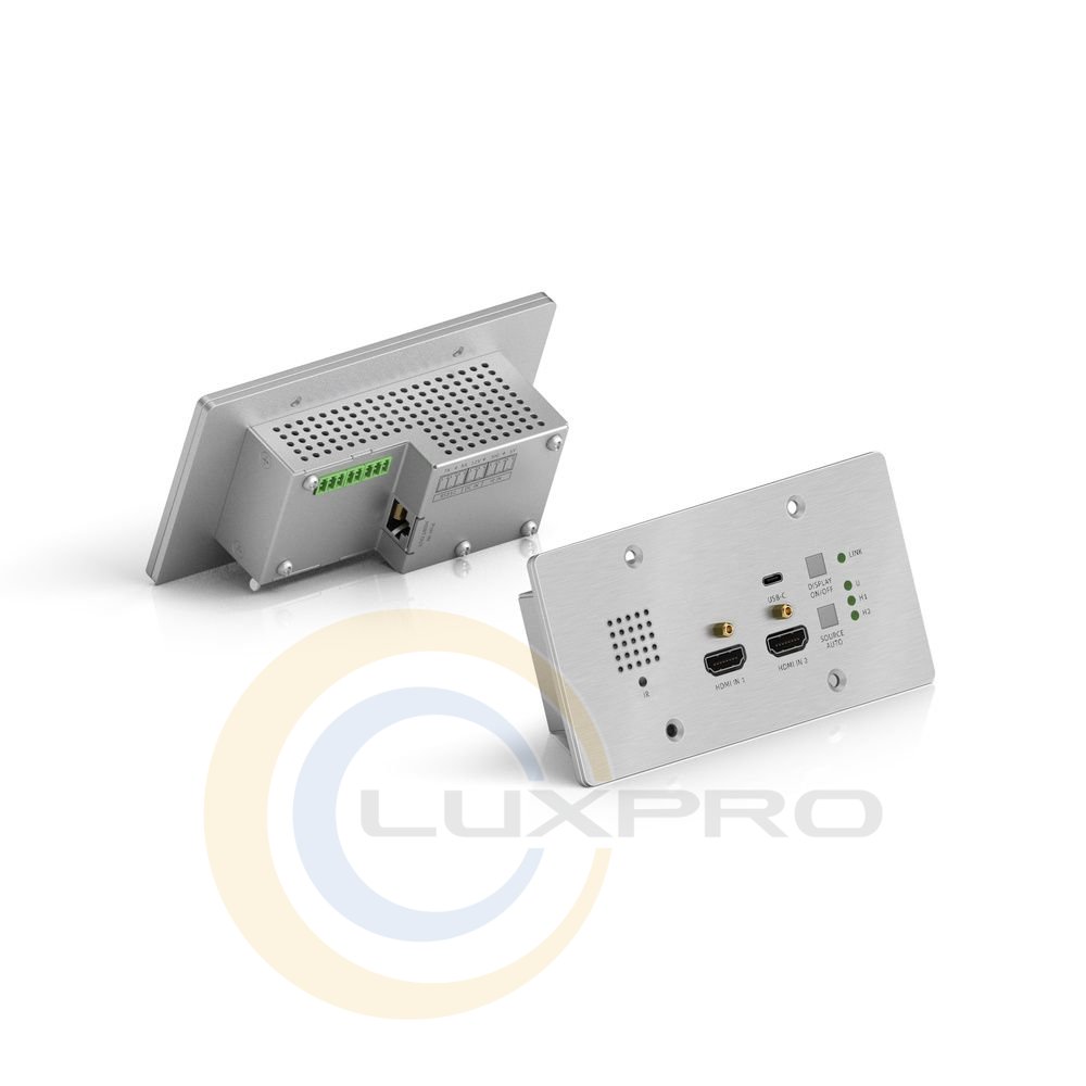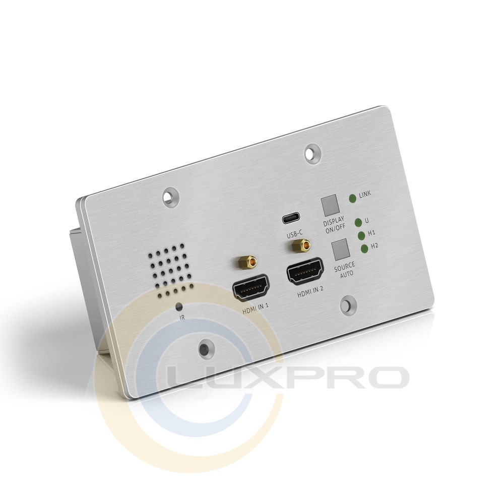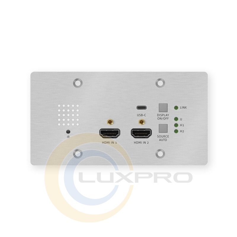 Комутатор має два входи HDMI та один USB-C. Його можна вибрати за допомогою кнопки SOURCE AUTO на передній панелі. Комутатор підтримує CEC. Кнопка DISPLAY ON/OFF на передній панелі використовується для керування зовнішнім пристроєм відображення і може бути запрограмована за допомогою команд інфрачервоного навчання або команд RS232 для забезпечення сумісності з різними пристроями відображення. Завдяки PoC 12–48 комутатор може отримувати живлення через сумісний приймач HDBaseT.