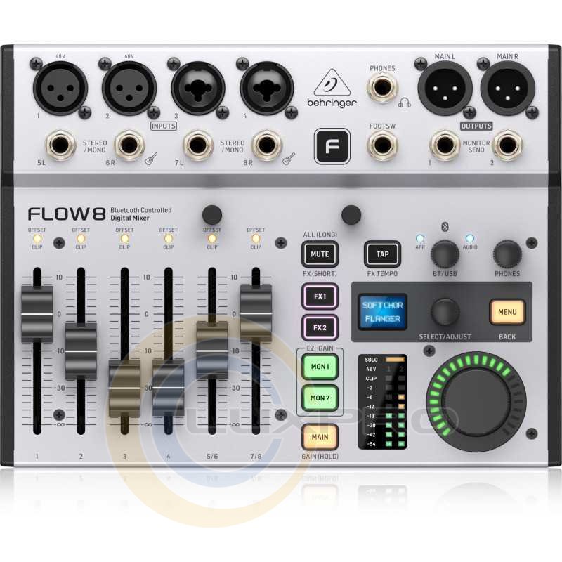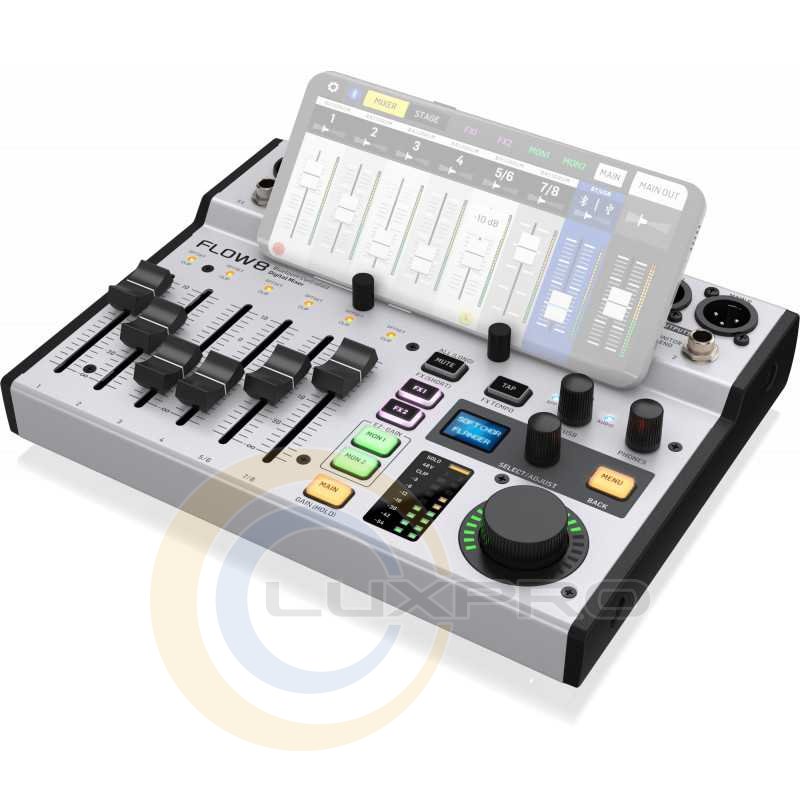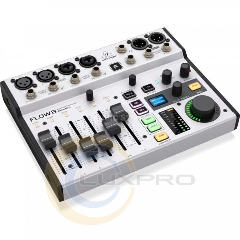 Оскільки кожна людина в сучасному світі має телефон або планшет, логічно, що Bluetooth зарекомендував себе як популярний стандарт аудіопідключень. Behringer FLOW 8 пропонує вбудований Bluetooth приймач, який дозволяє з комфортом програвати музику без дратівливих адаптерів та необхідності постійно перебувати поряд з мікшерною консоллю. Аудіоз'єднання Bluetooth для відтворення звуку може бути підключене незалежно від Flow Mix. При використанні Bluetooth для відтворення на одному мобільному пристрої можна керувати функціями з іншого пристрою.