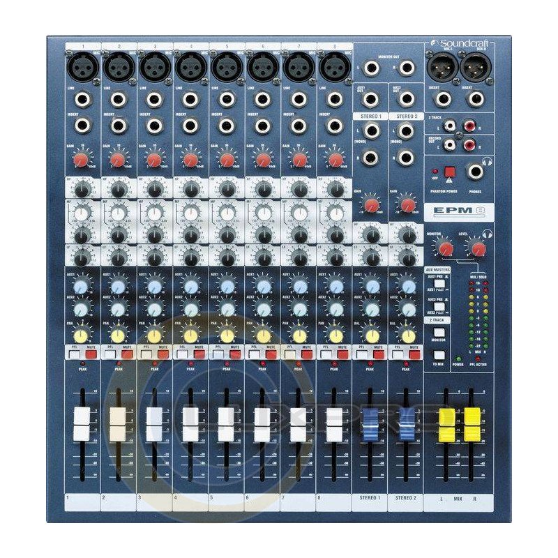 Мікшерний пульт EPM8 EU. Високопрозорий мікрофонний підсилювач GB30 (створений Гремом Блайтом до 30-річчя Компанії, який також використовується на великих консолях LX7ii і GB) відрізняється налаштуванням з високою роздільною здатністю в широкому діапазоні посилення 55 дБ, і забезпечує неймовірний запас перевантажувальної здатності. Професійне фантомне живлення 48 Вольт дозволяє підключати конденсаторні мікрофони всіх типів.