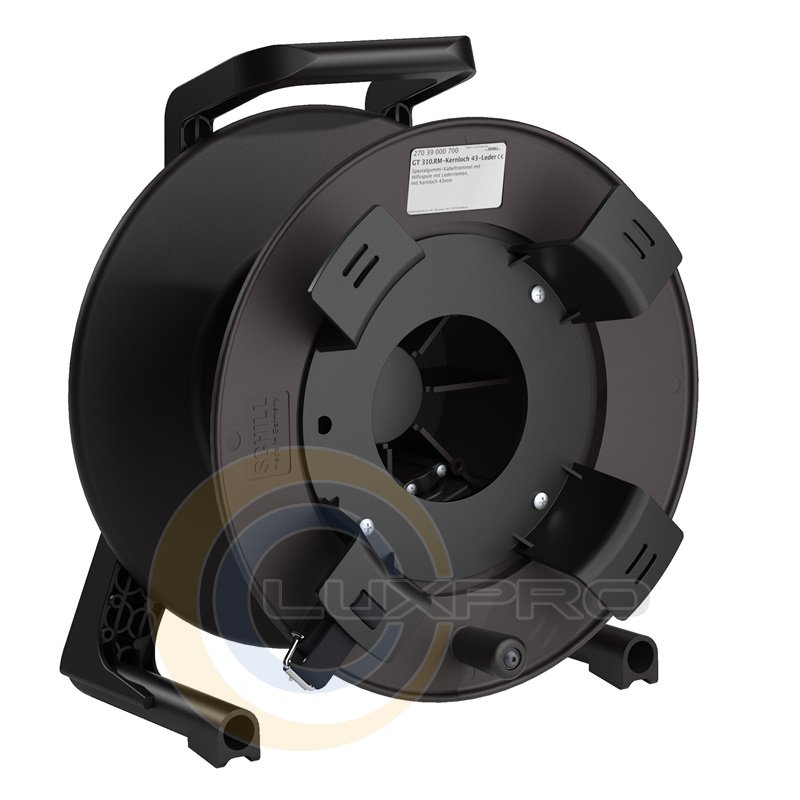 Легка кабельна котушка Schill GT 310.RM містить більше 100 метрів кабелю зовнішнім діаметром 7 мм. У модифікації RM для котушки в 310 розмірі є 4 кроштейни для фіксації кабелю. На всіх чотирьох тримачах кабелю зроблені спеціальні вуха для липучки, щоб закріпити змотаний кабель, і одна липучка поставляється в комплекті. На звороті легкої кабельної котушки GT 310 стоїть регульований стопор, що запобігає мимовільному розмотування. Всередині барабана отвір 43мм для проходу кабелю усередину. Виготовлена у Німеччині. Поставляється у картонній коробці.