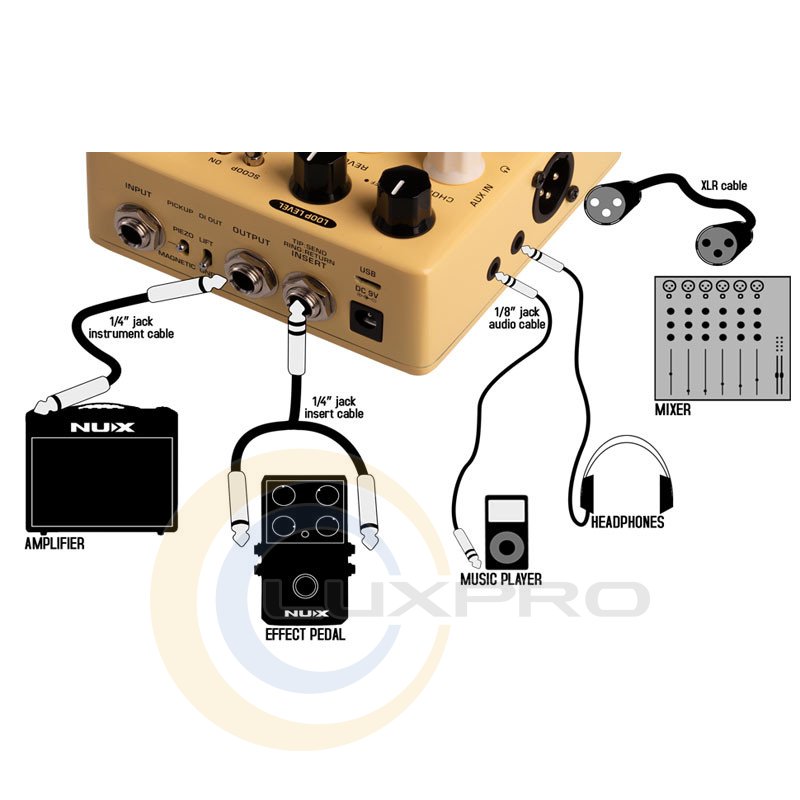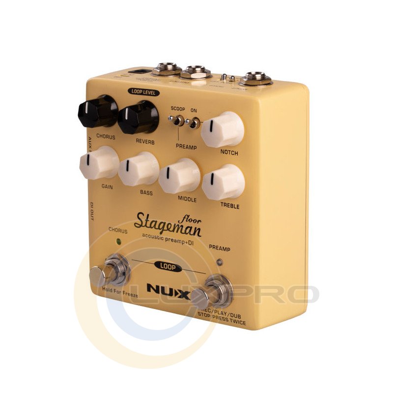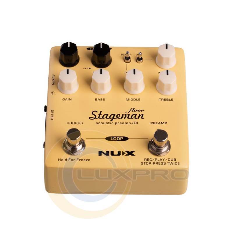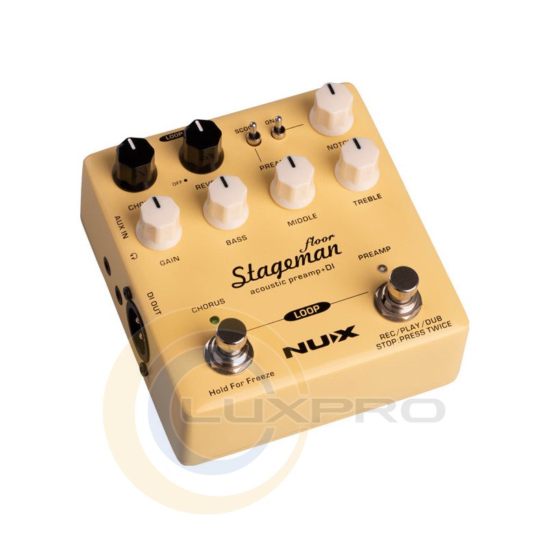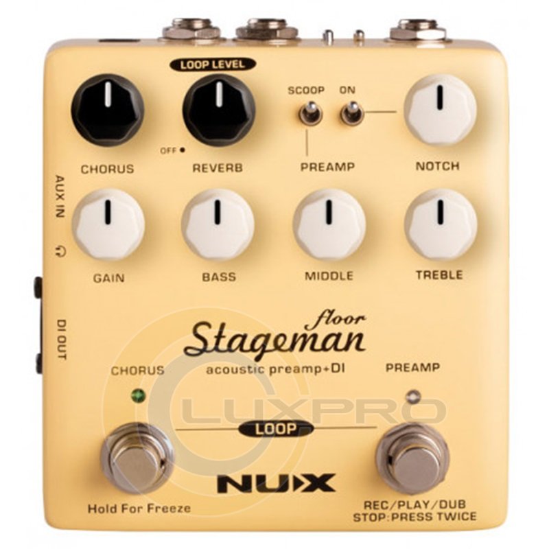 NUX Stageman Floor оснащений ефектами Chorus та Reverb, кожен з яких керується окремим регулятором. Повертання регулятора Chorus або Reverb від 0 до 10 дозволить координувати декілька параметрів. При натисканні та утриманні перемикача Chorus активується ефект Freeze, доки ви не відпустите його.