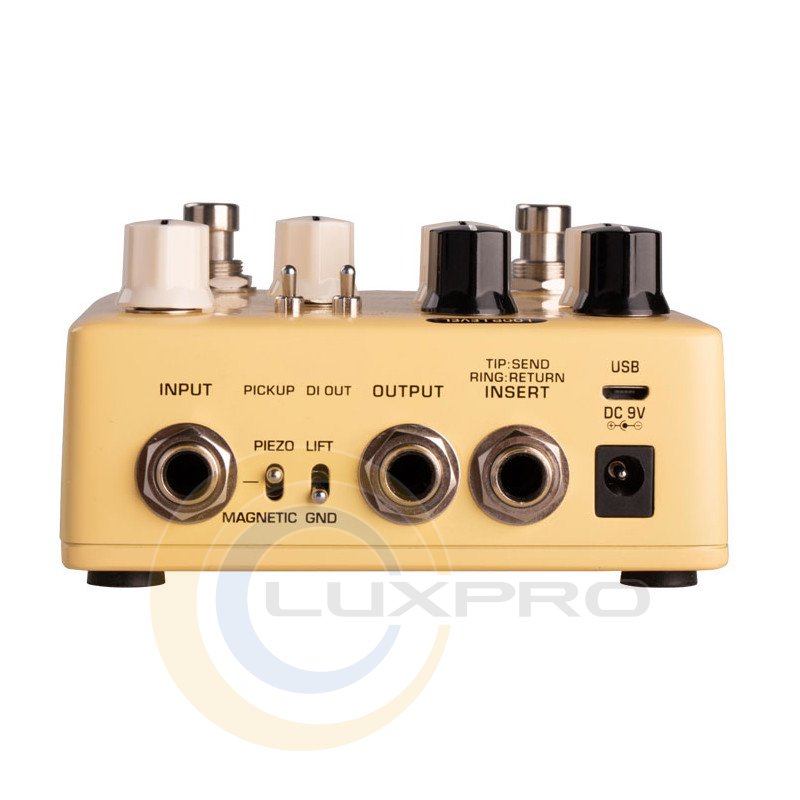 На педалі розташовані регулятори Gain та 3-смугового еквалайзера. Залежно від характеристик підсилювача/динаміка, стилю гри та типу корпусу акустичної гітари, ви можете налаштувати звук так, як вам подобається, використовуючи регулятори Gain, Bass, Middle та Treble.