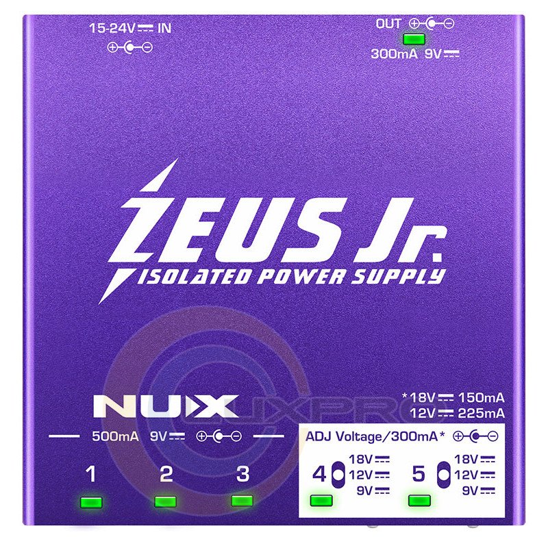 У ході наших досліджень ми виявили, що багато виробників використовували у своїх рішеннях блоків живлення «тороїдальні трансформатори», які хоч і можуть забезпечити чисте харчування, але мають недоліки в ефективності, вазі та розмірі. Тому ми знайшли найкраще рішення, яке ми назвали Zeus Jr. Zeus Jr. забезпечує 6 високоточних ізольованих виходів постійного струму. Включає 6 ізольованих імпульсних трансформаторів, що забезпечують чисте і стабільне джерело живлення для ваших педалей.