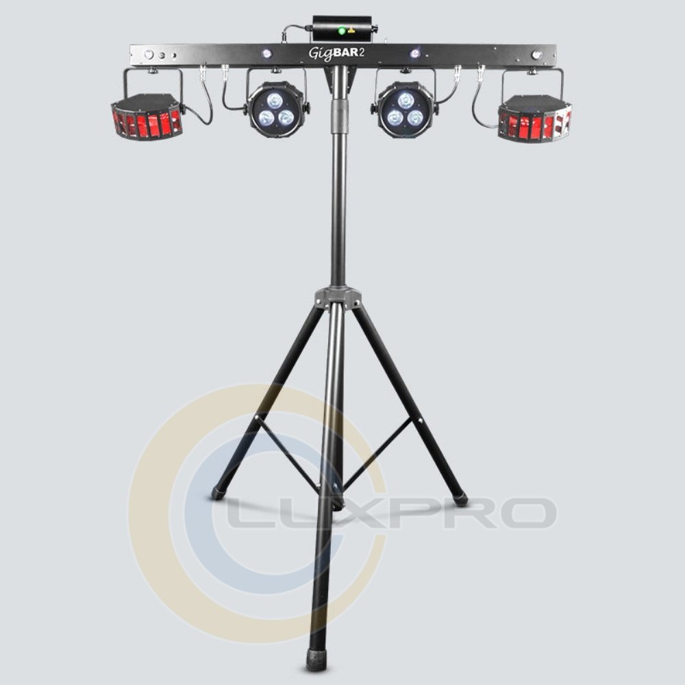 GigBAR 2 - це чудова мобільна система світлових ефектів, що включає заливку з ультрафіолетовим режимом і стробоскоп. GigBAR 2 складається з двох LED Derby приладів, заливки, лазера і чотирьох яскравих стробоскопів, змонтованих на одній стійці.