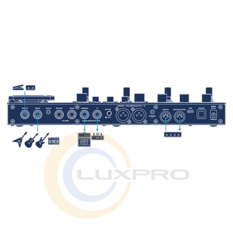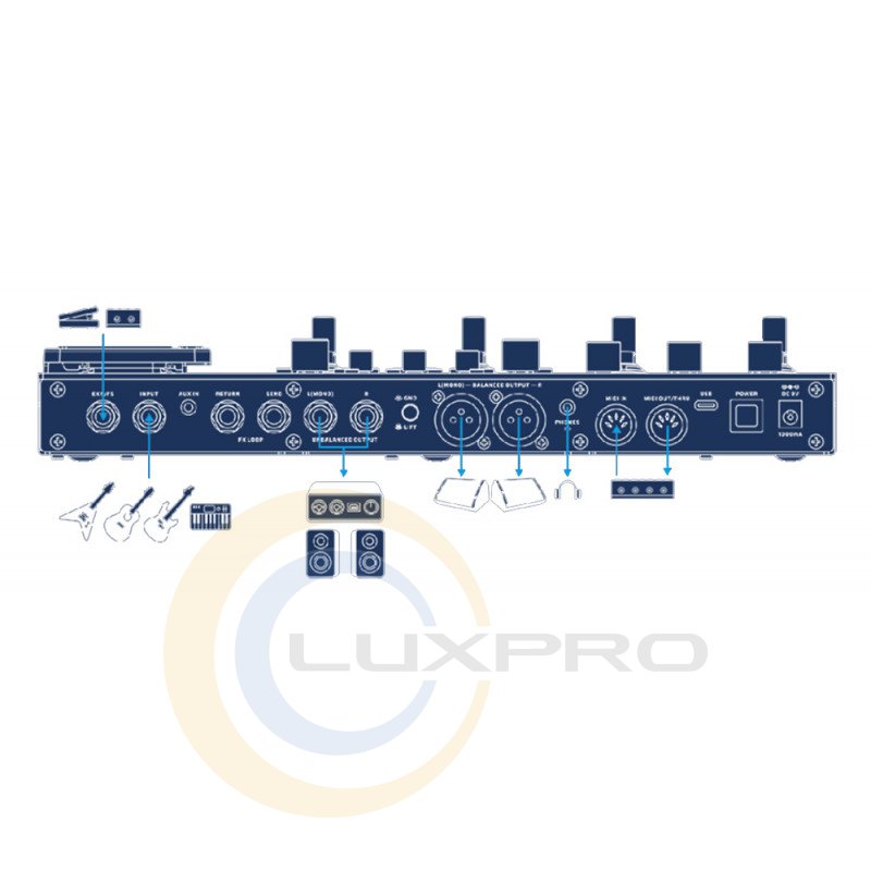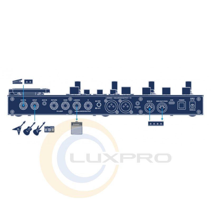 - Входи: 2 x 1/4" Unbalanced (TS) (guitar, return); 1 x 1/8" Stereo (TRS) (aux); 1 x USB 2.0 Type-C; 1 x MIDI 5-pin (IN/OUT/THRU);