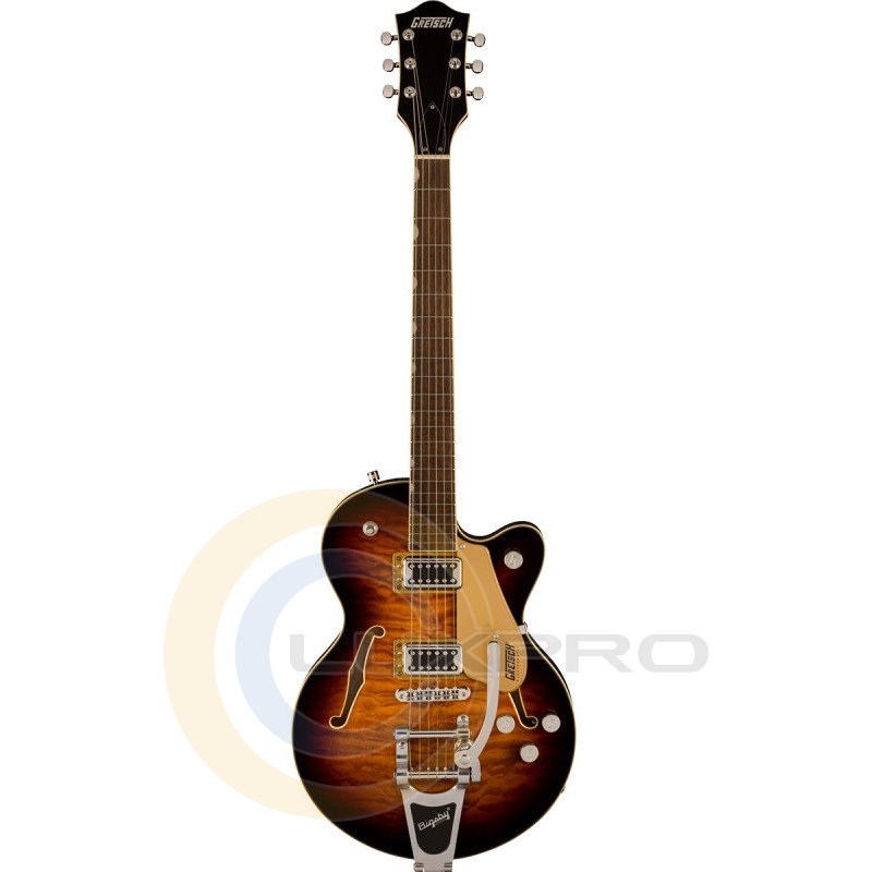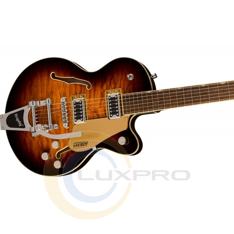 G5655T-QM ELECTROMATIC CENTER BLOCK JR. SINGLE-CUT QUILTED MAPLE WITH BIGSBY SWEET TEA - гітара. Компактний корпус зі стьобаного клена виглядає розкішно, а центральний блок з ялинки з порожніми камерами всередині надає об'єму і стійкості до зворотного зв'язку навіть на високій гучності. Завдяки розміру корпусу в 14 дюймів та кленовому грифу з тонким профілем, гітара зручно лежить у руках та підходить як для сцени, так і для студійної роботи.