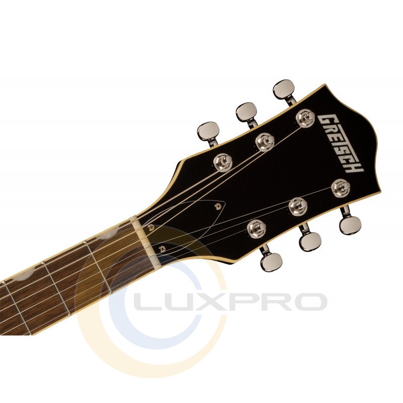 Накладка грифа з лавра з інкрустацією Neo-Classic, радіусом 12 дюймів та ладами Medium Jumbo забезпечує плавність та комфорт гри, навіть при швидких переходах між нотами. Пара хамбакерів Black Top Broad'Tron створює насичений звук із чіткими верхами та потужними середніми частотами, передаючи фірмовий тон Gretsch. Ви можете налаштувати звучання за допомогою головної ручки гучності з контуром високих частот, окремих регуляторів для кожного звукознімача, трипозиційного перемикача та майстер-регулятора тону.