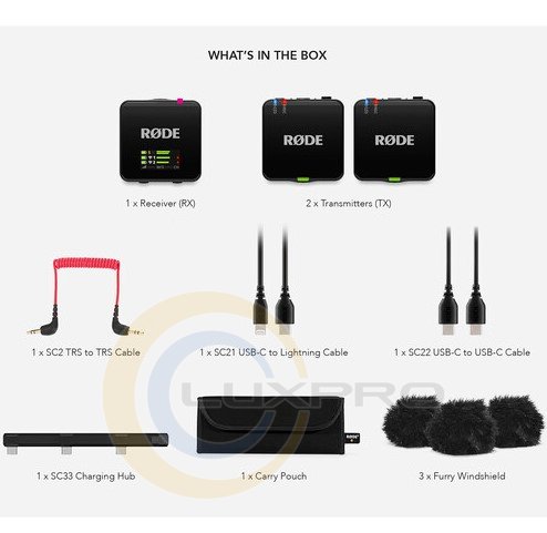 - Приймач, 2 передавачі, кабель SC22 (USB-C), кабель SC21 (USB-C - Lightning), кабель SC2 (TRS), зарядний пристрій SC33, хутряний вітрозахист (3 шт), чохол