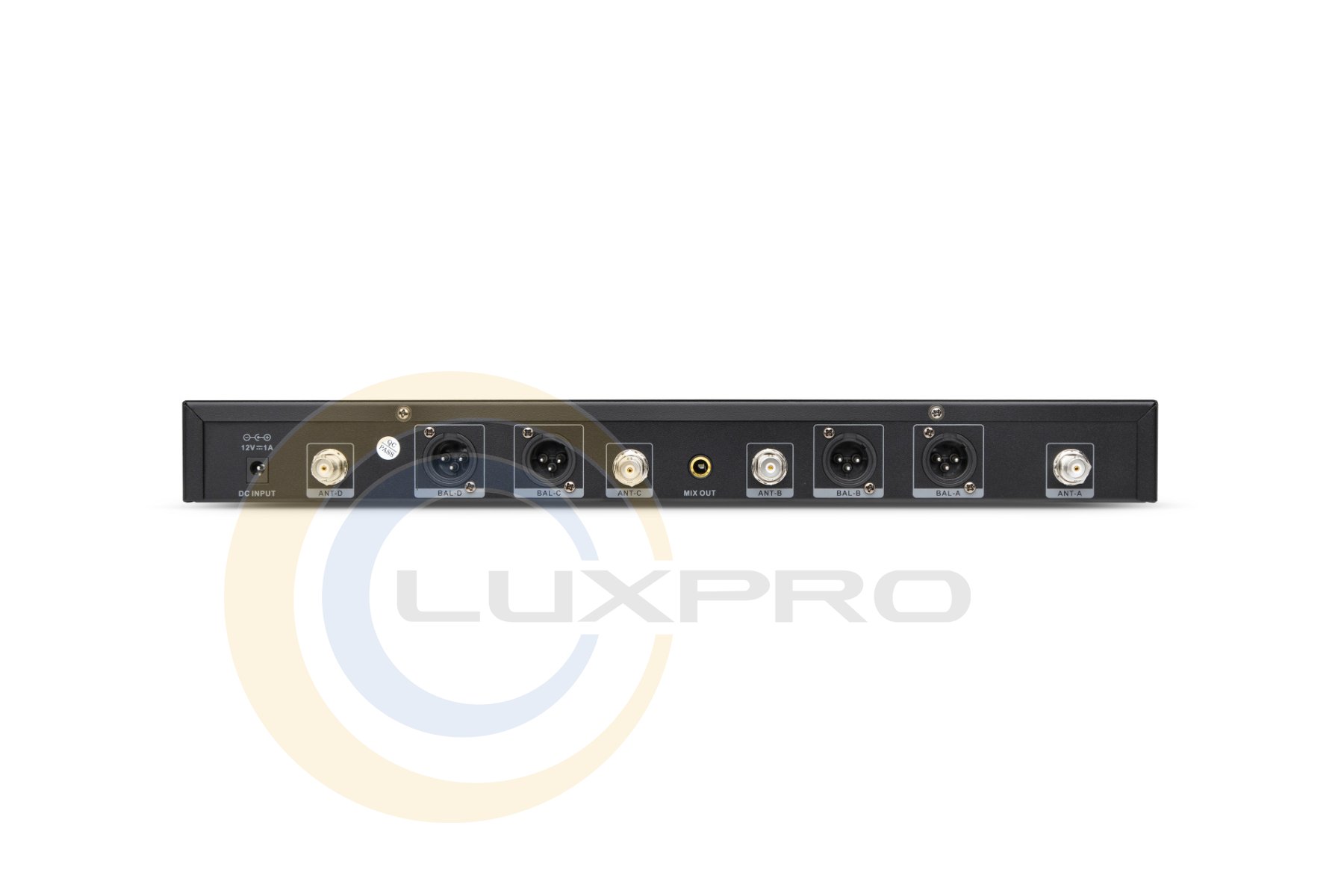 - приймач сигналу поєднує в собі чотири окремих ресивера в одному компактному корпусі. Він оснащений чотирма балансними роз'ємами XLR для роздільного підключення каналів системи і одного комбо роз'єму 1/4 "jack.- приймач забезпечений кольоровим TFT дисплеєм для кожного каналу на якому відображається вся необхідна інформація по стану роботи системи.- система має 4x24 каналів роботи (крок каналу 0,40Hz), канали можна вибрати в ручну, а тако ж є можливість синхронізації каналів по «IR».- cистема працює в діапазоні частот - Канал А: 518,00-527,75MHz В: 540.00-549,75MHz С: 575,00-584,75MHz D: 589,00-598,75MHz.- мережевий адаптер живлення підходить для мереж з напругою від 110В до 240В.- поясні передавачі живляться від двох "пальчикових" батарейок типу AA, які забезпечує безперебійну роботу до 8 годин.Характеристики: