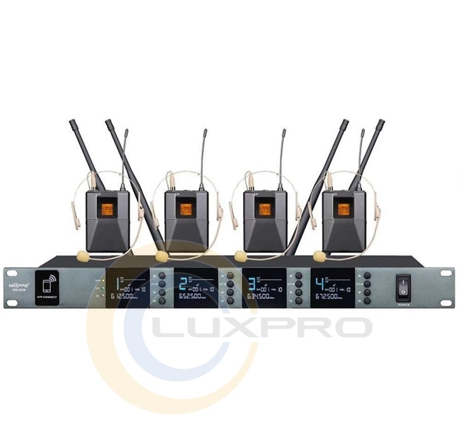- Двоканальна бездротова мікрофонна система з 4 головними гарнітурами;