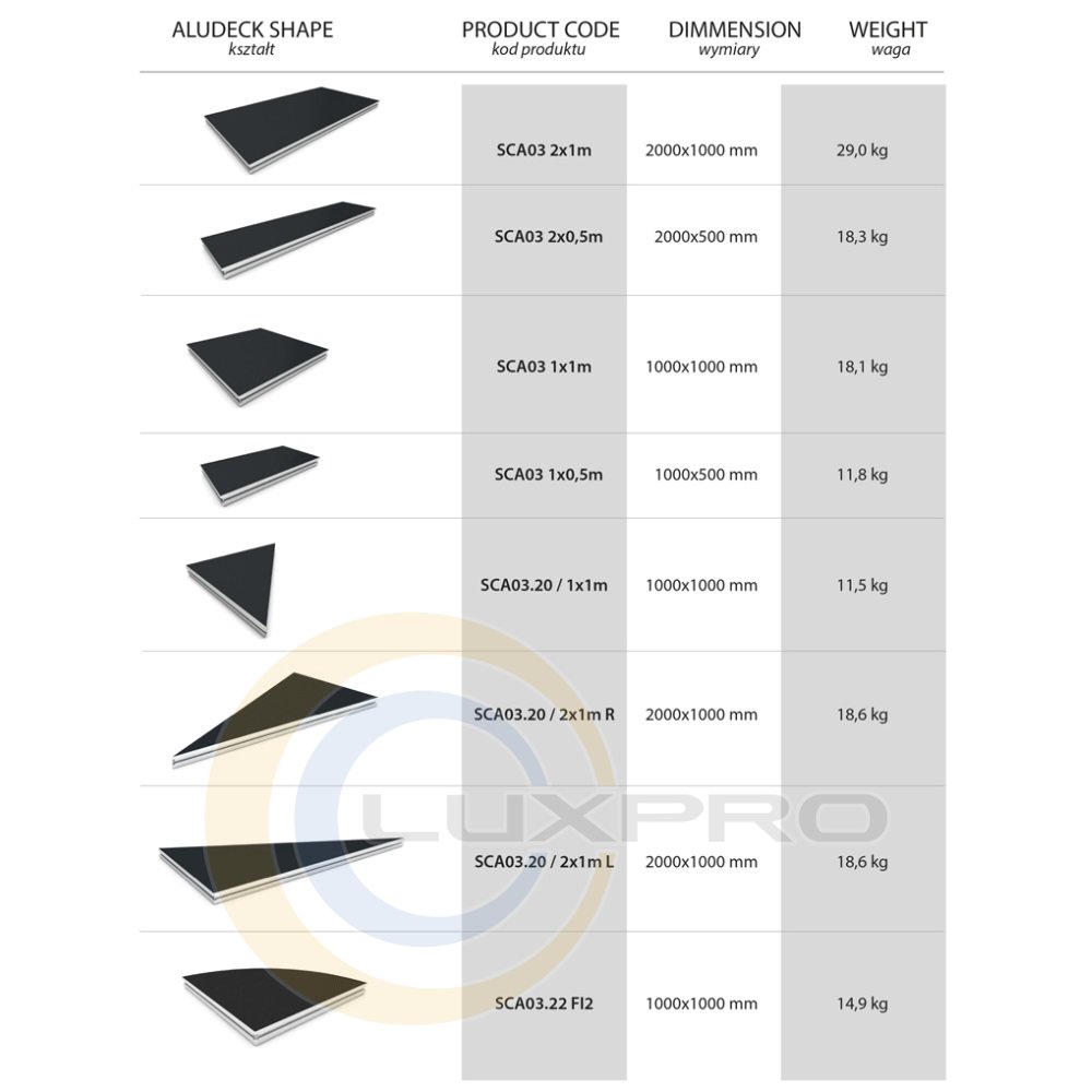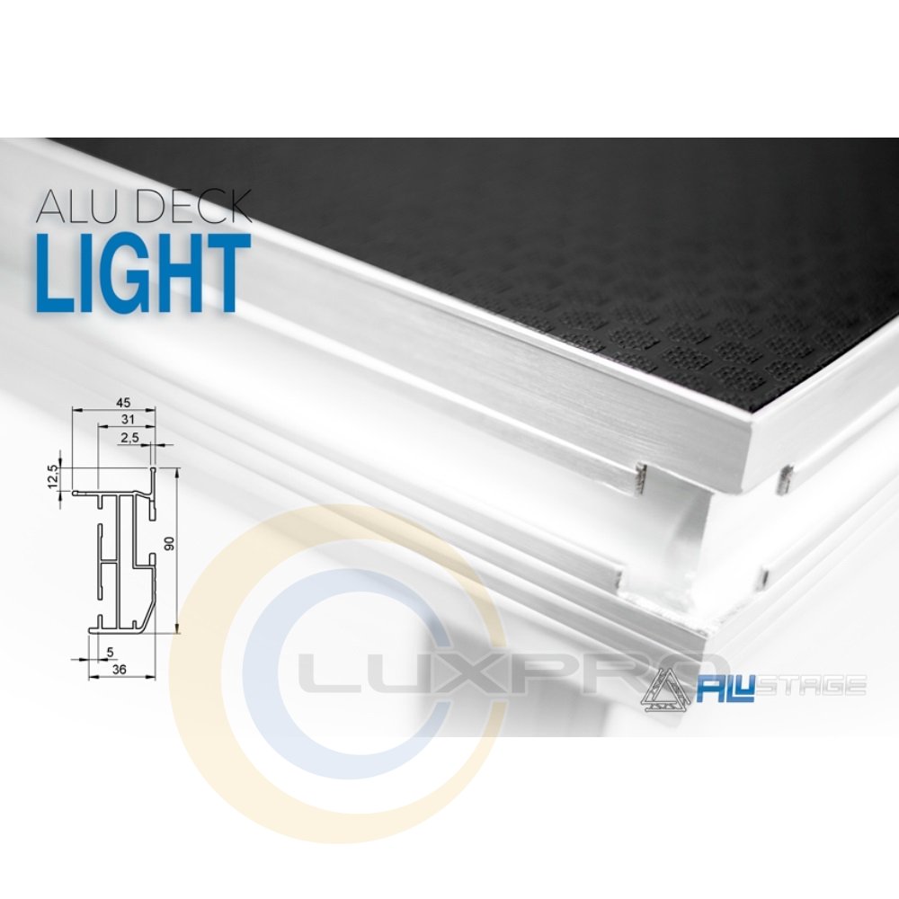 Платформа Stage AluDeck Light є базовою платформою компанії Alustage, призначена для спорудження сцен, подіумів для показу мод, залу для глядачів, платформ для проведення конференцій. Доступні розміри: 2.0x1.0 м (стандарт) / 2.0x0.5 м / 1.0x1.0 м / 1.0х0.5 м / 0.5х0.5 м і нестандартних розмірів. Спеціальна конструкція AluDeck Light забезпечує міцність 750 кг / м2, що підтверджується TUV сертифікатом.