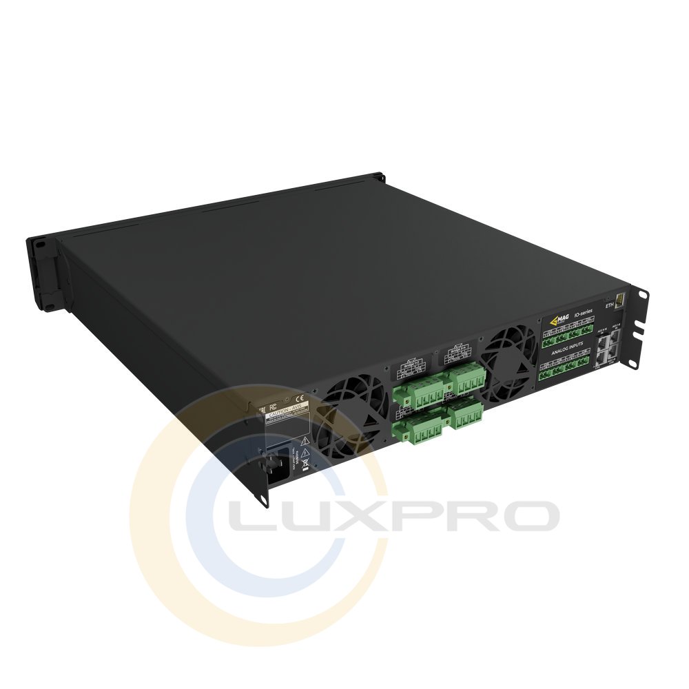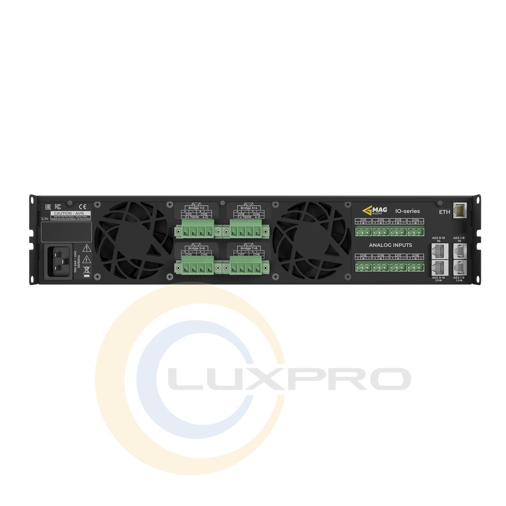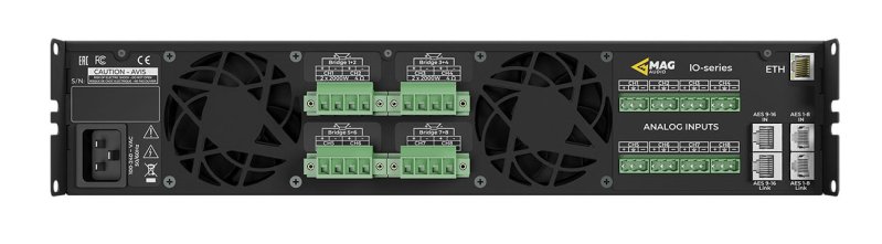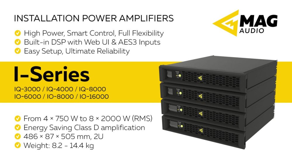 Підсилювачі I-Series створені на базі високоефективної архітектури класу D, мають єдиний форм-фактор (2U) та оснащені сучасним DSP DANA PRO з попередньо завантаженими пресетами гучномовців MAG Audio для швидкої конфігурації та досягнення найкращого результату. Попри різну кількість каналів і вихідну потужність, усі моделі базуються на спільній апаратній платформі, що спрощує проєктування системи та її масштабування.Підтримуються як аналогові (4 або 8), так і цифрові входи AES3 (до 16 каналів), що забезпечує сумісність із різними джерелами сигналу. Інтегрований інтуїтивний Web UI (веб-інтерфейс) надає можливість віддаленого керування та моніторингу всієї системи через мережу Ethernet із використанням стандартного веббраузера. Фактично, I-Series поєднує в собі функції підсилювача й системного процесора одночасно, а інсталятор або технічний користувач отримує єдиний центр контролю усією системою.Можливості DSP DANA PRO включають гнучку матрицю маршрутизації (вільний розподіл до 8 аналогових та 16 цифрових входів AES3 між усіма виходами), користувацькі налаштування еквалайзерів (графічного 1/3 октави та параметричного) для корекції АЧХ приміщення, налаштування затримки (delay), групування каналів та створення макрокоманд для зручного керування зонами або сценаріями, моніторинг стану системи (рівень сигналу, температура, статус каналів), а також загальне керування (майстер-фейдер, mute, standby тощо) в реальному часі.MAG Audio I-Series — це поєднання високоефективного підсилення та гнучкого DSP в одному пристрої. Від ресторанів та конференц-залів до великих арен — ці підсилювачі забезпечують якісний звук, повний контроль і безшовну інтеграцію з акустичними системами MAG Audio, стаючи серцем інсталяцій будь-якого масштабу.Характеристики: