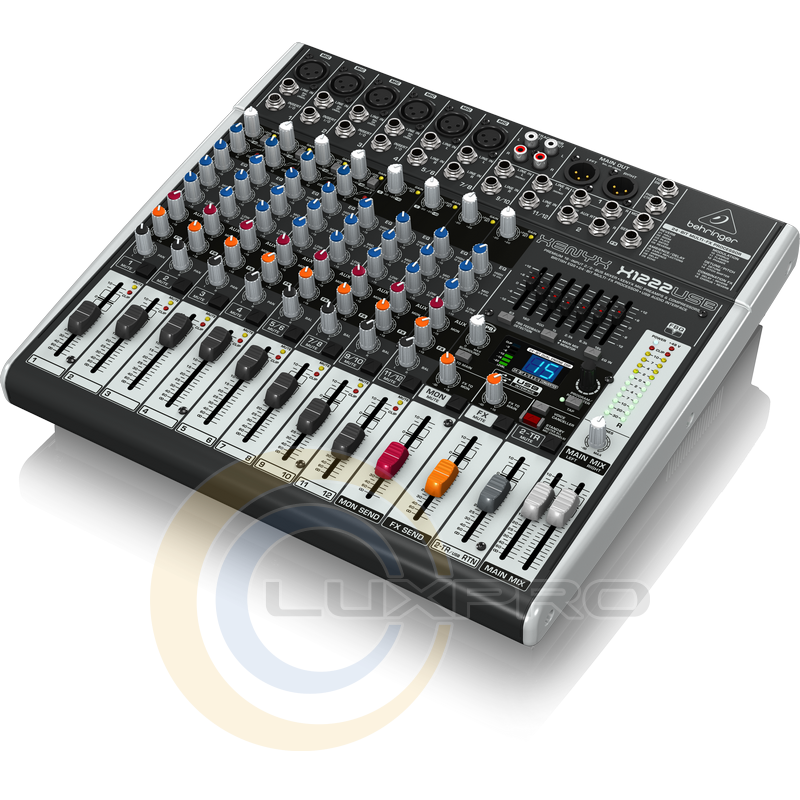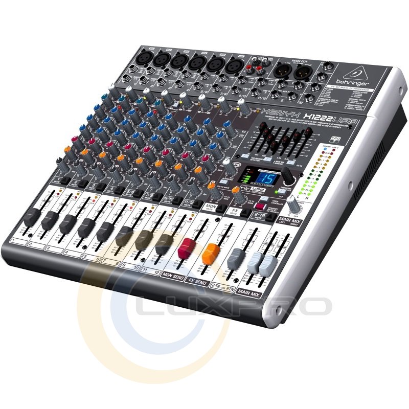 XENYX X1222USB має 4 монофонических вхідних роз'єму, 4 стереофонічних, а також 6 мікрофонних входів з предусилителями, що забезпечують динамічний діапазон 130 дБ, і фантомним живленням 48 V, що робить мікшер придатним для використання з мікрофонами і динамічного, і конденсаторного типу. Моноканали оснащені фільтрами низьких частот, в більшості випадків вирішальними проблему паразитарних шумів ще на рівні вхідного сигналу. Компресори на монофонических каналах дозволяють досягти ще кращої якості аудіо, вирівнюючи значні перепади інтенсивності та нормалізіруя сигнал.