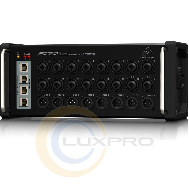 SD16 - це комутаційний блок, який представляє собою цифровий сценічний блок для підключення аудіо пристроїв до цифрових мікшерів X16 і X32, а також мониторних систем. Функціональність модуля значно підвищується завдяки інтерфейсам AES50, ADAT, ULTRANET, USB, MIDI і наявності дистанційного керування.
